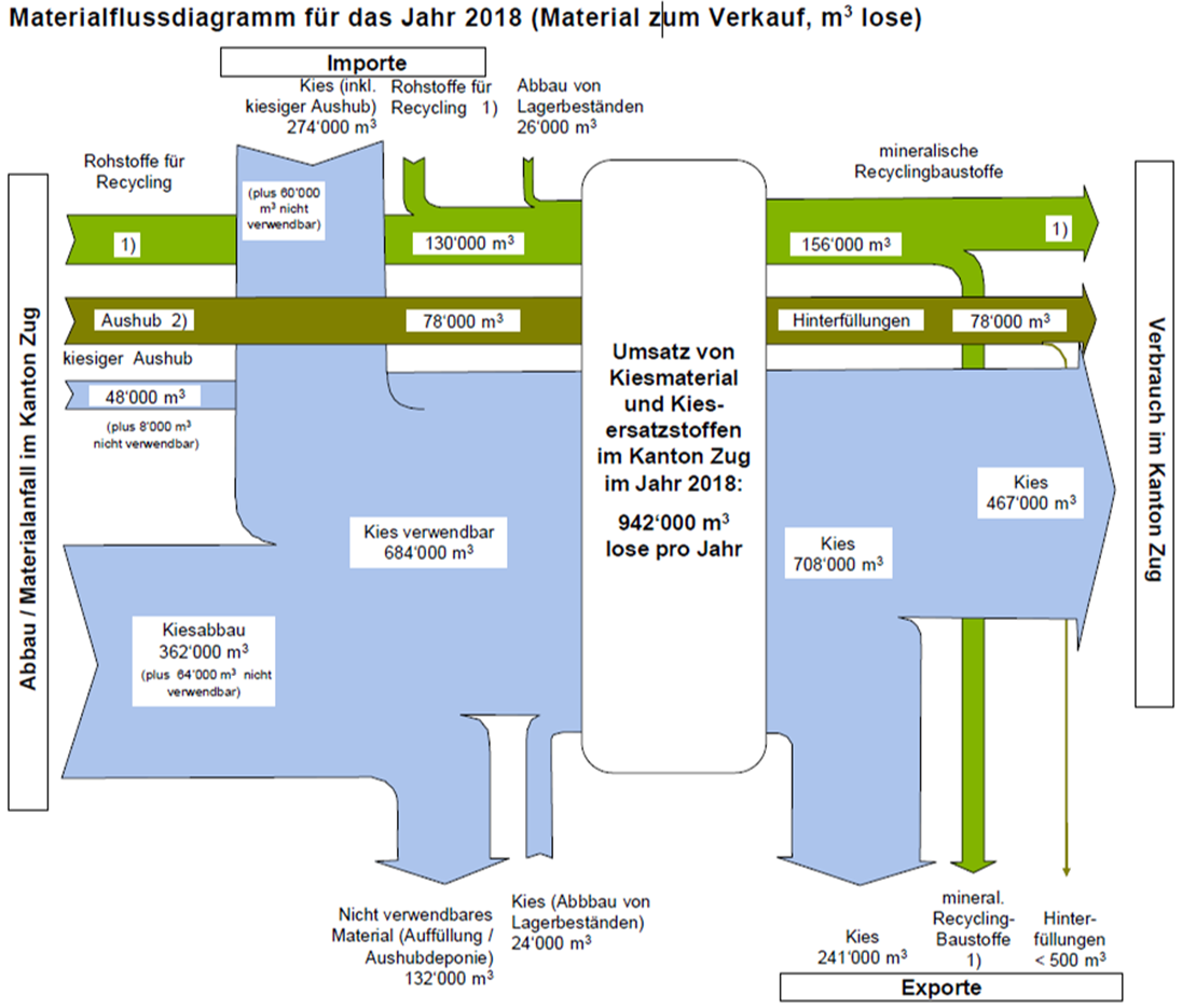 Im Jahr 2018 bauten sämtliche Kieswerke im Kanton Zug rund 362'000 m3 Kies in den Zuger Abbaustellen ab. Diese Abbaumenge liegt im Vergleich zu den Vorjahren markant tiefer, d. h. deutlich unter dem mehrjährigen Durchschnitt von 468'000 m3 Kies. Der Kiesumsatz im Kanton Zug belief sich im vergangenen Jahr auf 708'000 m3. Der Import von Kies in den Kanton Zug betrug im Jahr 2018 rund 39 % des gesamten Kiesumsatzes. Der Anteil der Exporte am Kiesumsatz belief sich auf 34 % des Kiesumsatzes. Daraus resultiert nach zuletzt vier Jahren mit Exportüberschüssen wieder ein Importüberschuss.
