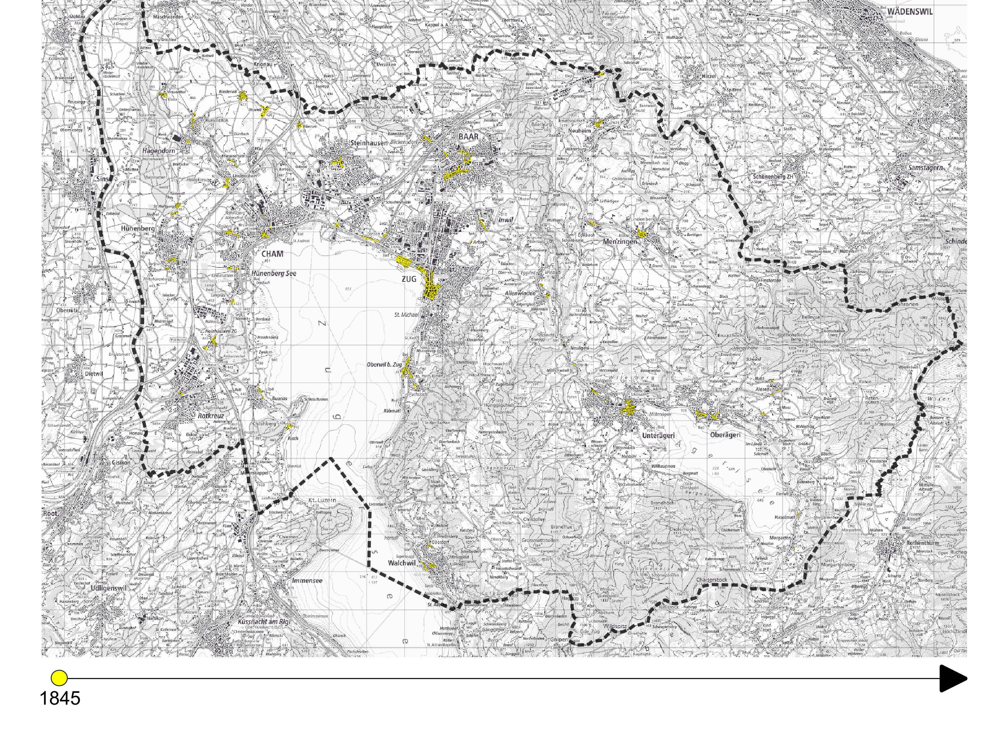 Für die Visualisierung der Siedlungsentwicklung im Kanton Zug seit 1845 wurden die überbauten Flächen ab historischen Karten erfasst. Es werden nicht die Bauzonen abgebildet und die Flächen sind nicht parzellenscharf abgegrenzt. Beispielsweise sind auch Weiler eingezeichnet, die nicht zur Bauzone im rechtlichen Sinn gehören. Man muss sich bei der Betrachtung bewusst sein, dass die je nach Jahr verschiedenen verfügbaren Grundlagen und Erhebungsmethoden sowie auch die unterschiedlich grossen Zeitabstände zu einem uneinheitlichen Bild führen.