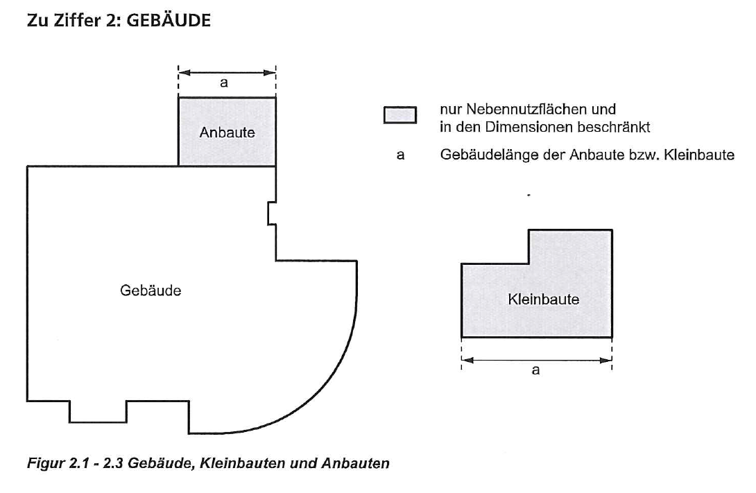 Die Dimensionen von An- und Kleinbauten sind beschränkt. Die Figur 2.1 bis 2.3 im Anhang 2 der IVHB ist nicht ganz vollständig, denn es wäre nicht zulässig, nur die Länge von Anbauten zu beschränken, nicht aber die Breite. Die Verordnung enthält auch eine Flächenbeschränkung.