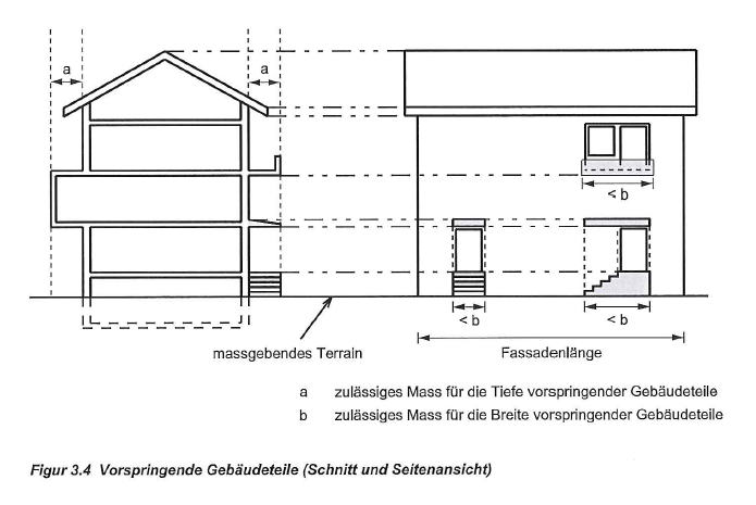 1 Die Fassadenflucht ist die Mantelfläche, gebildet aus den lotrechten Geraden durch die äussersten Punkte des Baukörpers über dem massgebenden Terrain. Vorspringende und unbedeutende rückspringende Gebäudeteile werden nicht berücksichtigt.