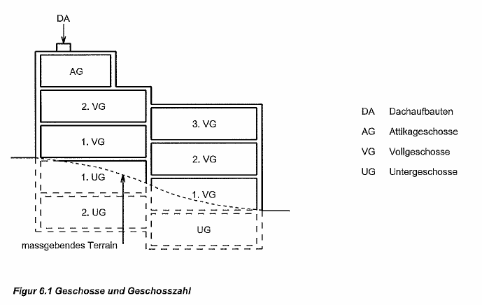 1 Vollgeschosse sind alle Geschosse von Gebäuden, ausser Unter-, Dach- und Attikageschosse. Bei zusammengebauten Gebäuden und bei Gebäuden, die in der Höhe oder in der Situation gestaffelt sind, wird die Vollgeschosszahl für jeden Gebäudeteil bzw. für jedes Gebäude separat ermittelt.