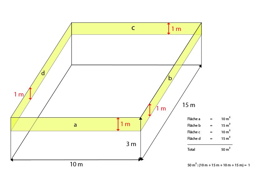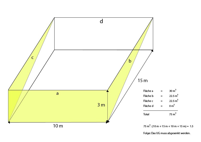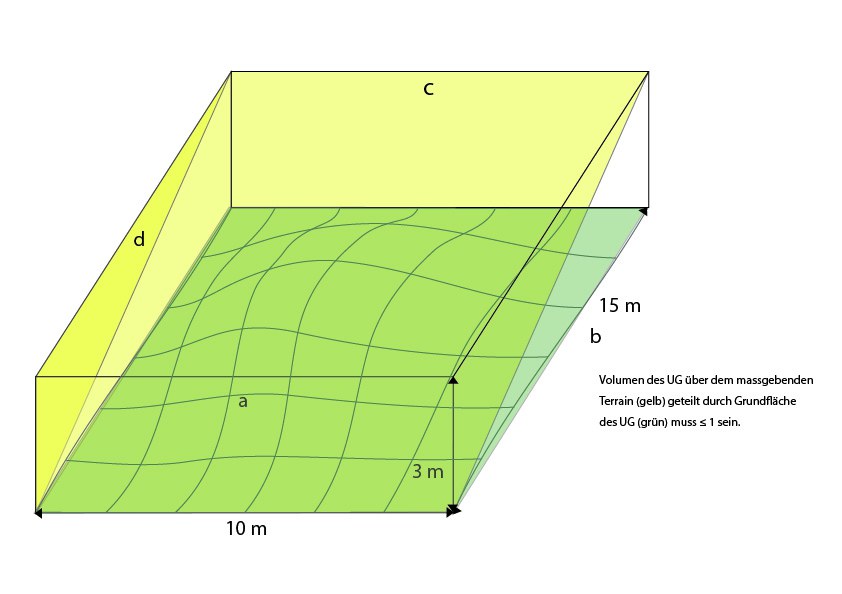 Es kann aber noch eine genauere Berechnung erfolgen: Für die Berechnung des mittleren Masses kann das über dem massgebenden Terrain geplante Volumen des Untergeschosses durch seine Grundfläche geteilt werden. Das Resultat dieser Berechnung ergibt das mittlere Mass, um wie viel das Untergeschoss aus dem massgebenden Terrain herausragt.