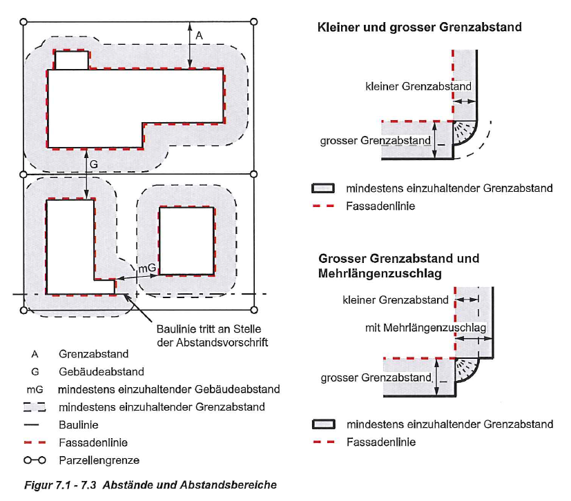 Der Text des Konkordats regelt nicht, wie bei grossen und kleinen Grenzabständen und bei Mehrlängenzuschlägen gemessen wird. Die Figur 7.1 bis 7.3 im Anhang 2 der IVHB enthält indessen eine Messvorschrift, die verbindlich ist: Danach wird der grosse Grenzabstand senkrecht zur Hauptfassade (also dort, wo nach kantonalem Recht der grosse Grenzabstand zur Anwendung kommt) gemessen. In den Gebäudeecken gilt immer der kleine Grenzabstand zur Parzellengrenze. In gleicher Art wird der Mehrlängenzuschlag dort zum kleinen oder grossen Grenzabstand hinzugerechnet und dort senkrecht zur Fassadenlinie gemessen, wo ein Mehrlängenzuschlag zur Anwendung kommt. Die Kantone differenzieren regelmässig die Grenzabstände für besondere Fälle wie Kleinbauten (Ziffer 2.2 Anhang 1 der IVHB), Anbauten (Ziffer 2.3 Anhang 1 der IVHB), unterirdische Bauten (Ziffer 2.4 Anhang 1 der IVHB) und Unterniveaubauten (Ziffer 2.5 Anhang 1 der IVHB).