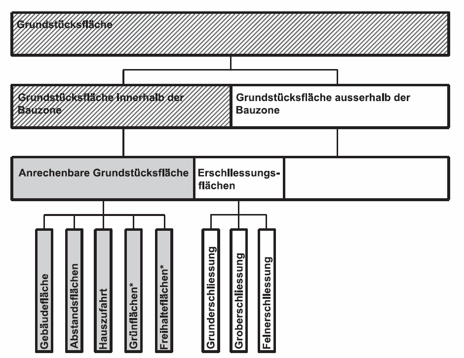 1 Zur anrechenbaren Grundstücksfläche (aGSF) gehören die in der entsprechenden Bauzone liegenden Grundstücksflächen bzw. Grundstücksteile. Die Flächen der Hauszufahrten werden angerechnet. Nicht angerechnet werden die Flächen der Grund-, Grob- und Feinerschliessung.