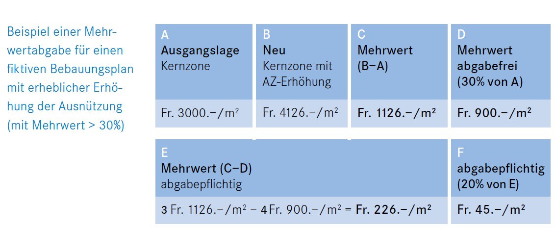 Die Gemeinden können in ihren Bauordnungen festlegen, dass sie mittels verwaltungsrechtlichem Vertrag bei Umzonungen von den Grundeigentümerinnen und Grundeigentümern eine Mehrwertabgabe von maximal 20 Prozent für das den bisherigen Bodenmehrwert von mehr als 30 Prozent übersteigende Mass erheben können. Kommt also der Bodenquadratmeterpreis nach einer Umzonung namentlich von einer bisherigen Arbeits- neu in eine Wohn- und Arbeitszone auf mehr als das Eineinhalbfache des bisherigen Werts zu liegen, kann die Gemeinde gestützt auf einen vorgängig abzuschliessenden verwaltungsrechtlichen Vertrag eine Mehrwertabgabe von maximal 20 Prozent des den bisherigen Bodenmehrwert von mehr als 30 Prozent übersteigenden Masses verlangen. Dasselbe gilt für Aufzonungen und Bebauungspläne mit Erhöhung des Nutzungsmasses. Auch hier ist nur für das die Nutzungserhöhung von mehr als 30 Prozent übersteigende Mass eine Mehrwertabgabe geschuldet. Gleichzeitig soll gewährleistet werden, dass Aufzonungen namentlich von der W1 in die W2 nicht bereits der Mehrwertabgabe unterstellt werden können. Aus diesem Grund ist die Mehrwertabgabe bei Aufzonungen und Bebauungsplänen mit Erhöhung des Nutzungsmasses erst geschuldet, wenn gleichzeitig eine Erhöhung der Ausnützungsziffer von mehr als 0,3 vorliegt. Gilt auf einer aufzuzonenden oder in einem Bebauungsplanperimeter liegenden Bauparzelle als Masseinheit für die Baudichte die Baumassenziffer, ist eine Erhöhung des Nutzungsmasses um 1,2 (ist äquivalent mit dem Vierfachen der Ausnützungsziffer) von der Mehrwertabgabe ausgenommen.
