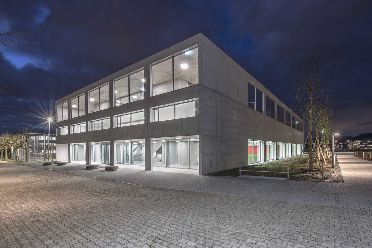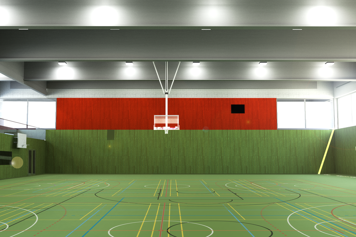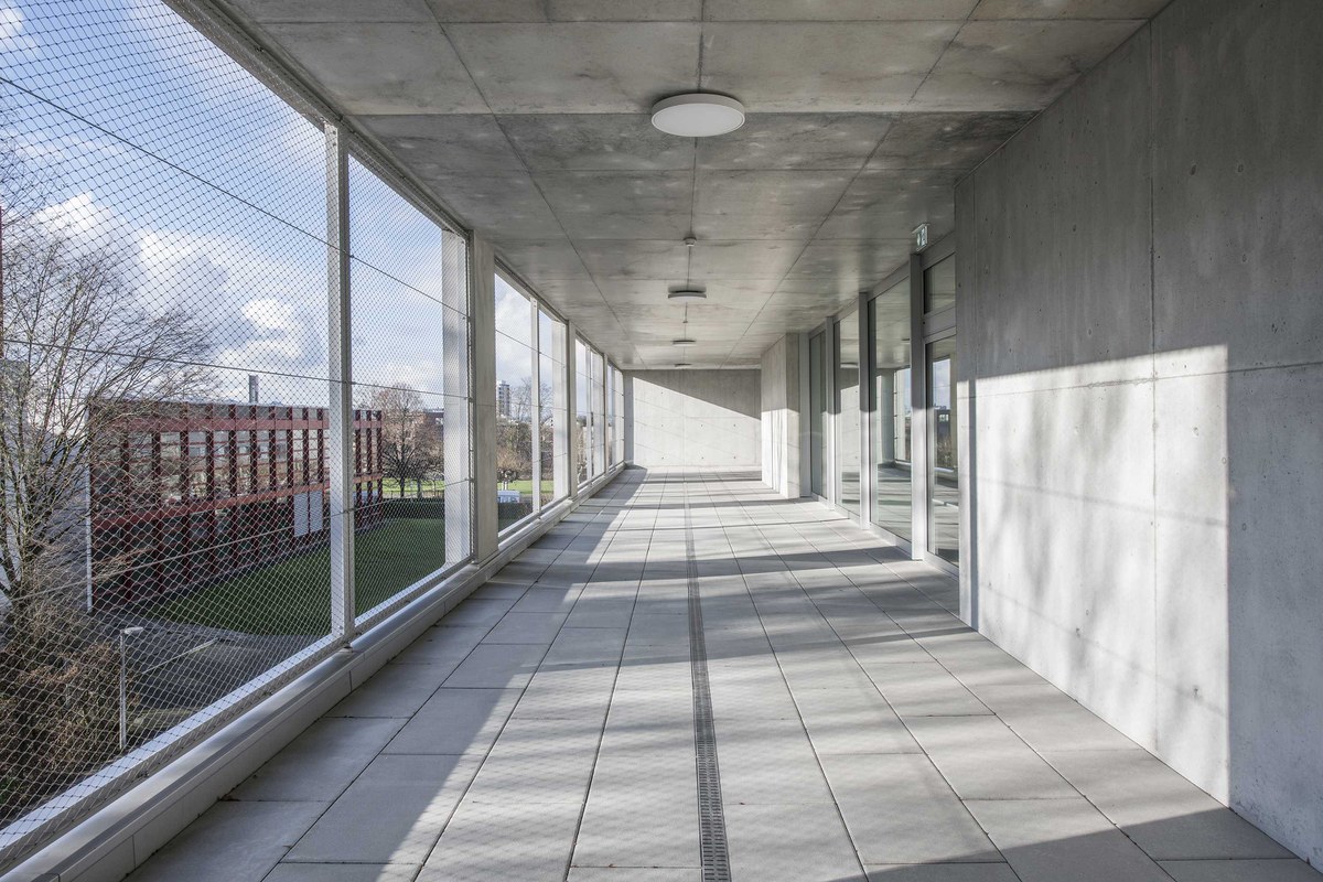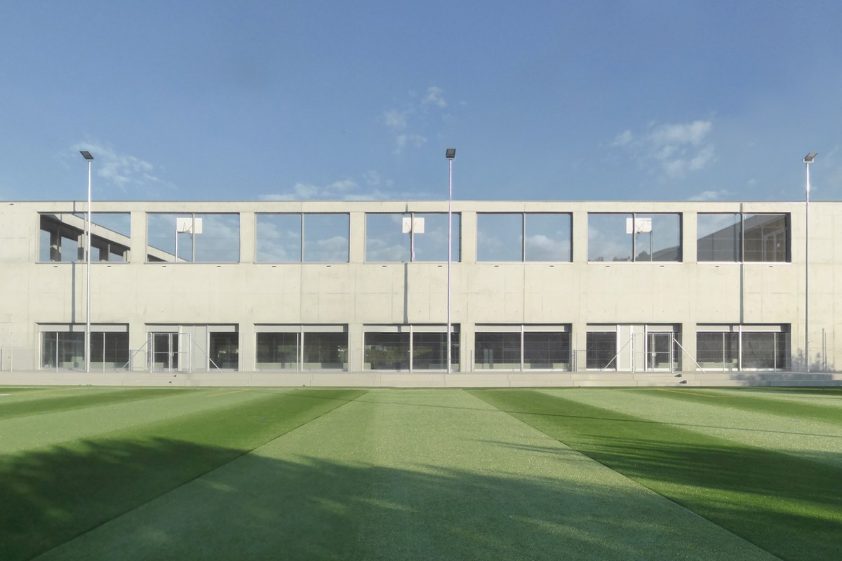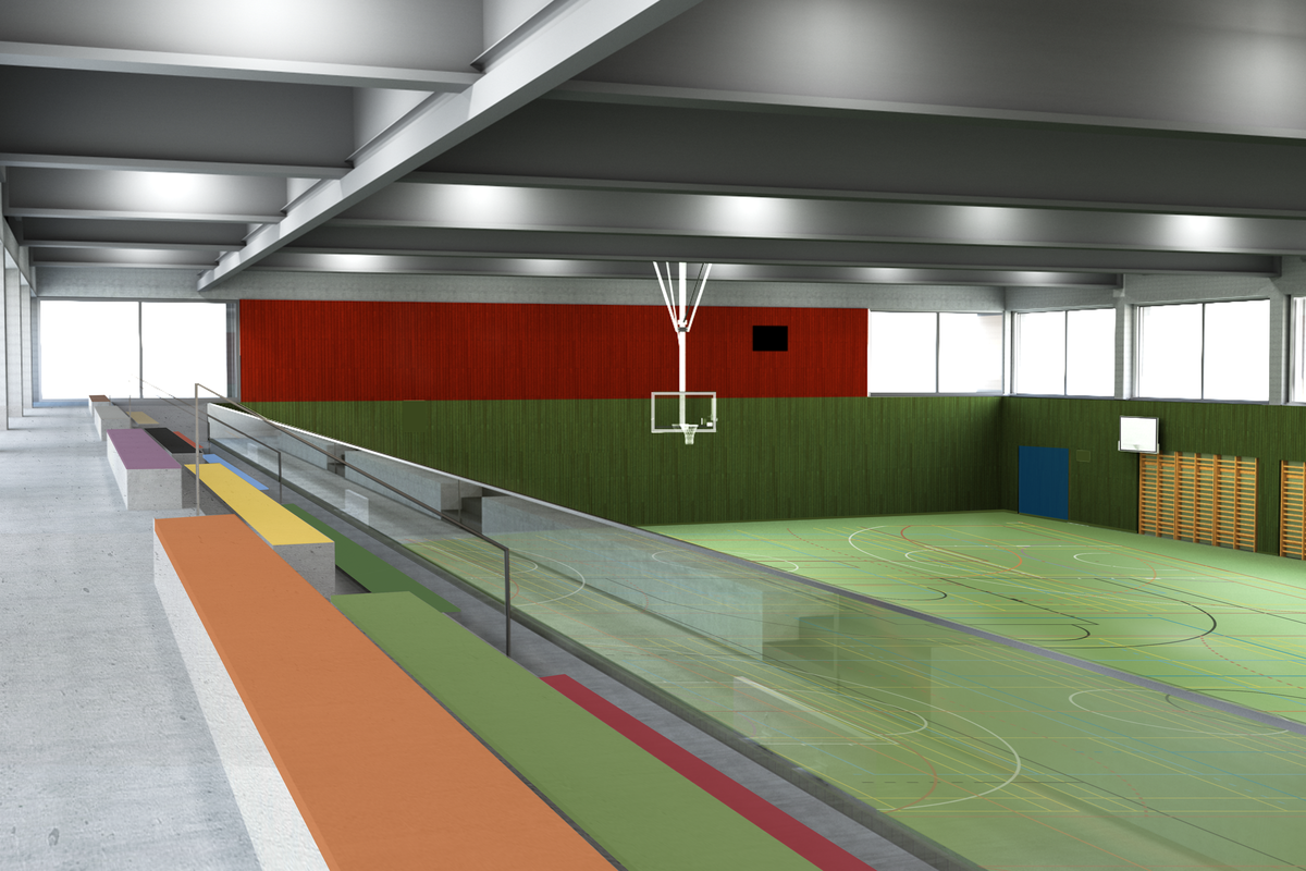 Mit seiner sowohl aussen als auch innen durchgängigen Materialisierung in Sichtbeton orientiert sich das Gebäude ebenfalls am Bestand. Umso stärker heben sich davon die Flächen des Hallen-, Zuschauer- und Garderobebereichs ab, die sich der Farbpalette der Spielfeldmarkierungen bedienen. Wie beim Schulraumprovisorium zeichnete auch hier die Künstlerin Monika Kiss für das Farbkonzept verantwortlich.