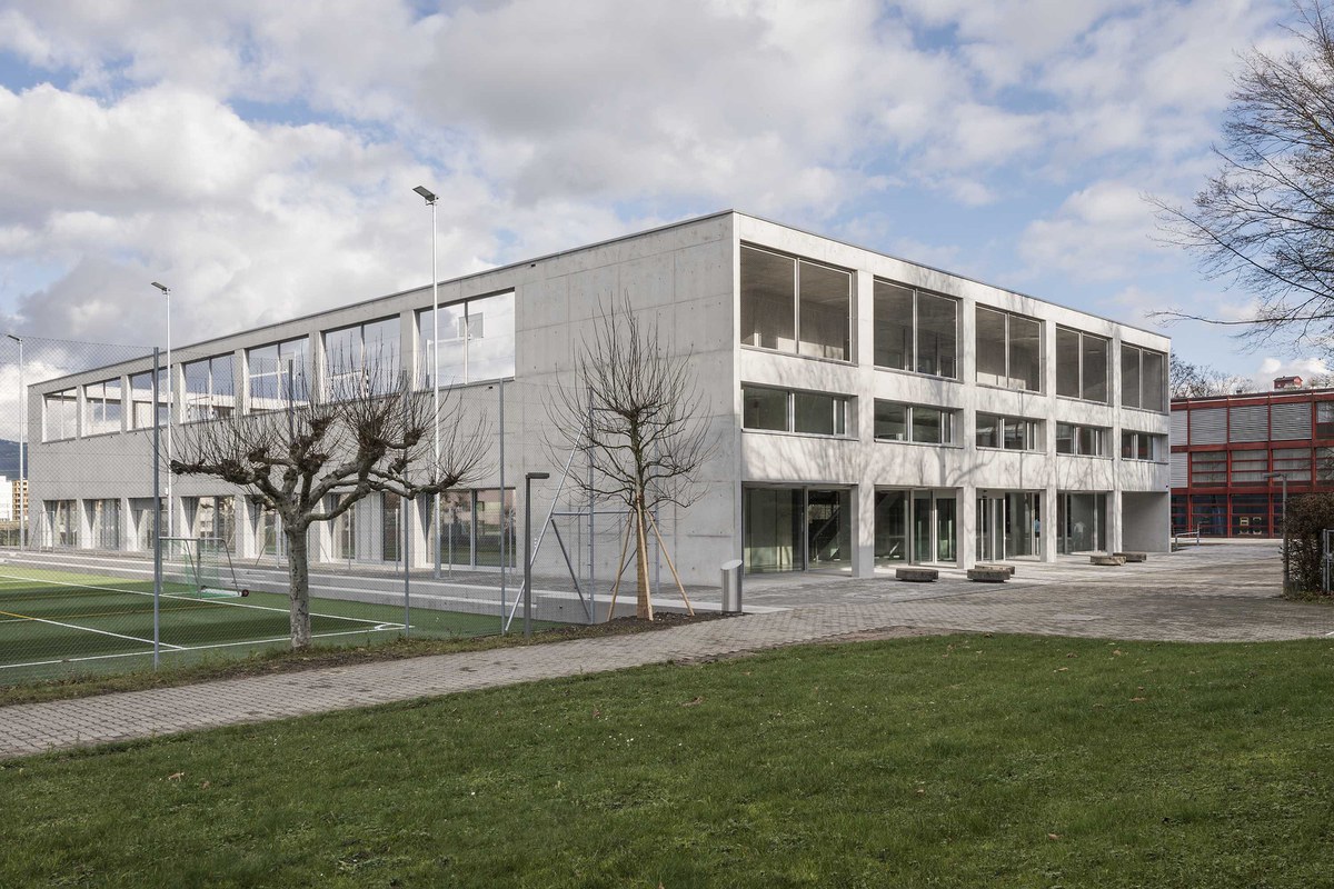 Das Gebäude nimmt den Standort des bestehenden Hartplatzes im Norden des Schulareals in unmittelbarer Nähe zum bestehenden Turnhallentrakt ein. In Abstimmung mit der architektonisch bedeutenden Gesamtanlage aus den frühen 1970er Jahren ist die Dreifachsporthalle teilweise in den Boden eingelassen. Dadurch tritt das Gebäudevolumen nach aussen lediglich mit drei Normalgeschossen in Erscheinung und ermöglicht gleichzeitig eine unterirdische Anordnung der Garderoben- und Geräteräume, womit die beanspruchte Grundstücksfläche auf ein Minimum reduziert wird. Der Ersatz für den Hartplatz befindet sich auf dem Dach des Gebäudes. Auf beiden Schmalseiten wird die Halle jeweils durch eine Raumschicht gefasst. Zur bestehenden Schulanlage hin sind übereinander der Eingangs-, der Lehrer- sowie der Vorbereich zum Hartplatz angeordnet. Auf der Nordseite befindet sich die Aussentreppe zum Hartplatz auf dem Dach.