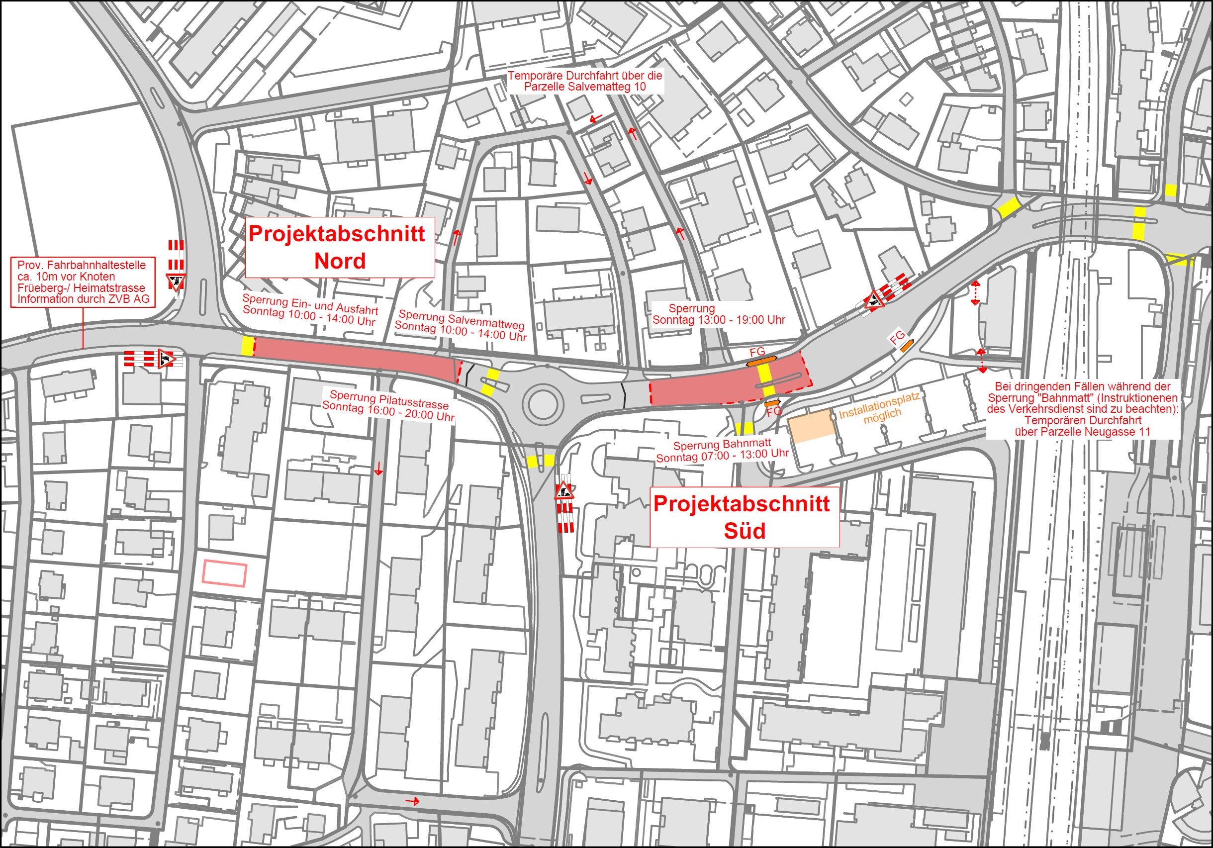 Die Zu- und Wegfahrten zu den angrenzenden Liegenschaften können, je nach Bauphase, nicht gewährleistet werden. So muss die Zufahrt zum Quartier Bahnmatt voraussichtlich am Sonntag, 30. August 2020, zwischen 7.00 und 13.00 Uhr gesperrt werden.