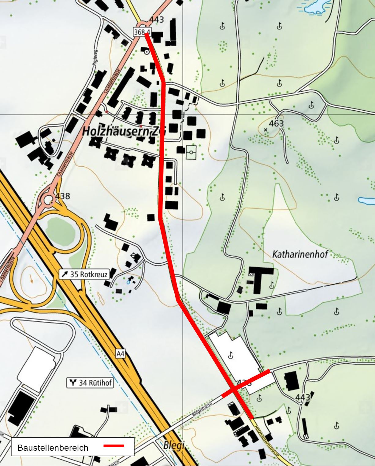 Auf der Holzhäusernstrasse werden die Deckbelagsarbeiten in der darauffolgenden Nacht ausgeführt. Dafür wird der Strassenabschnitt vom Kreisel Holzhäusern bis inklusive Knoten Holzhäusern-/Blegi-/Langackerstrasse vom Samstag, 6. Juni 2020, 18.00 Uhr, bis Sonntag, 7. Juni 2020, 18.00 Uhr, gesperrt und der Verkehr über Rotkreuz und Buonas umgeleitet. Die Anwohnerinnen und Anwohner können voraussichtlich bereits um die Mittagszeit ihre Zufahrten benutzen. Die Zufahrt zum Golfpark ist voraussichtlich ab 8.00 Uhr über die Blegistrasse möglich.