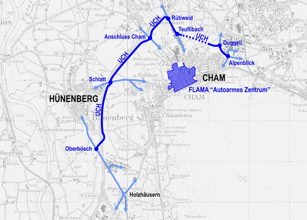 Der Kanton Zug entwickelte die Umfahrung Cham–Hünenberg gemeinsam mit den Ennetseegemeinden. Die Linienführung verläuft mehrheitlich parallel zur Autobahn A4 und kommt so mit einem minimalen Landverbrauch aus. Sie gewährleistet die von den Ennetseegemeinden vorgesehene Siedlungs- und Landschaftsentwicklung. Die Stimmberechtigten des Kantons Zug haben den Objektkredit für die Umfahrung Cham–Hünenberg im Jahr 2007 angenommen.