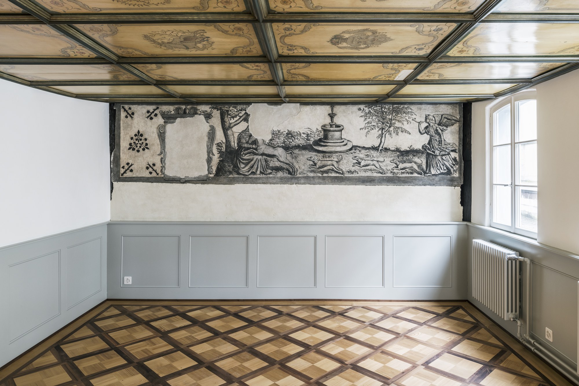In den drei historischen Häusern bleiben nach den jüngsten Arbeiten die verschiedenen Zeitschichten im Innen- und Aussenraum erfahrbar. Beim Haus Kolinplatz 19, dessen Anfänge ins Jahr 1461 zurückgehen, wurden die Vorfenster und die historischen Fensterläden repariert, restauriert und wieder eingesetzt. Im Innern konnten haustypische Elemente wie ein Kachelofen, Türen mit barocken Beschlägen und weitere Ausstattungselemente erhalten werden. In den oberen Geschossen des Hauses Kirchenstrasse 3 – zusammen mit dem Haus Kirchenstrasse 5 erbaut ab 1438 – wurden bei den Wohnungseingängen Schablonenmalereien, die unter jüngeren Verkleidungen zum Vorschein kamen, wieder zugänglich gemacht. Ausserdem konnten Wandverkleidungen verschiedenen Alters wiederverwendet werden. Als eine kleine Sensation galt der im Zuge der Bauuntersuchungen gemachte Fund einer figürlichen Grisaillemalerei von hervorragender Qualität aus dem ersten Drittel des 17. Jahrhunderts. Die hinter den Wandverkleidungen im ersten Obergeschoss gefundene Malerei stellt die sogenannte mystische Einhornjagd dar. Sie wurde im Zuge der Umbauarbeiten sorgfältig restauriert.