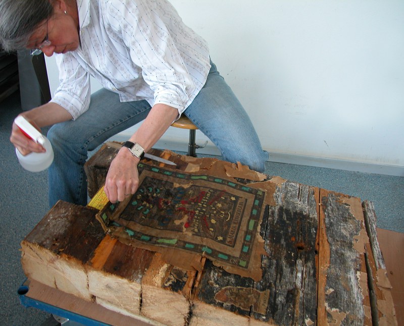 Vor dem Abbruch 2009 wurde das historische Bauernhaus Chammersbüel in Unterägeri bauhistorisch untersucht. An der Wand einer Schlafkammer entdeckten die Fachleute einen wertvollen Druck («Spickelbild») mit der Ansicht des Klosters Einsiedeln um 1800‒30. Das Wandstück wurde ausgesägt und samt dem Druck geborgen. Im Fundlabor wurde der Druck sorgfältig abgelöst und gereinigt und gefestigt.