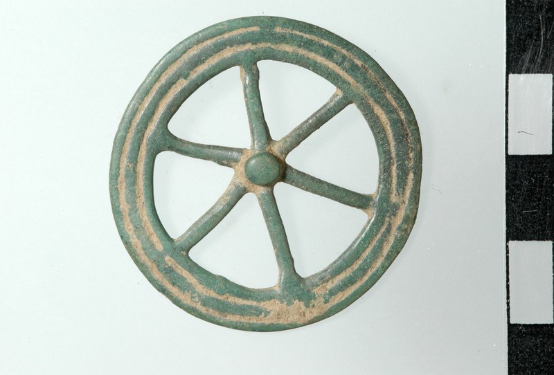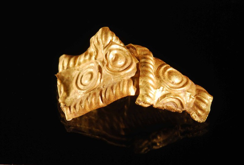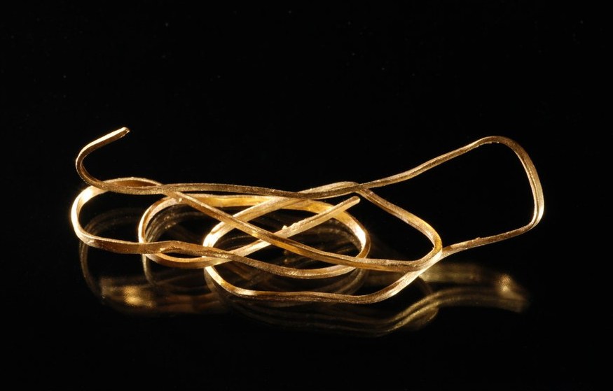 Gefaltetes, verziertes Goldblechband mit Brandspuren aus einem beraubten, spätbronzezeitlichen Steinkistengrab. Die Art der Verzierung ist typisch für die an sich sehr raren Goldfunde der Spätbronzezeit, eine ähnliche Verzierung findet sich beispielsweise auf einem als Diadem angesprochenen Goldblech aus einem Frauengrab aus Binningen im Kanton Baselland.