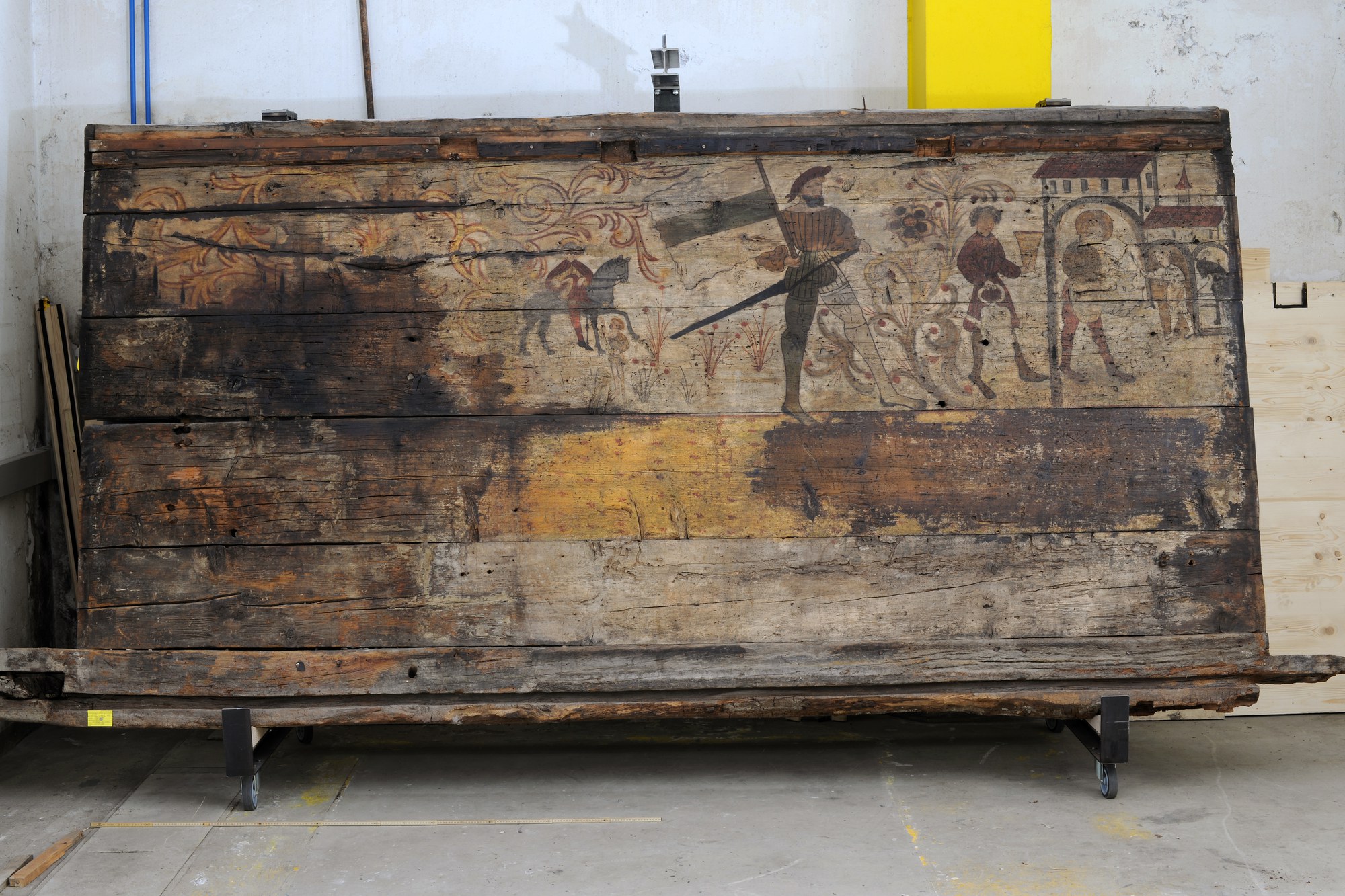 Bevor das Haus Leihgasse 39/41 in Baar abgebrochen wurde, führte das Amt für Denkmalpflege und Archäologie eine baugeschichtliche Untersuchung durch. Dabei stellte sich überraschend heraus, dass sich, gewissermassen ummantelt von der Bausubstanz aus dem 17. Jahrhundert, ein mittelalterlicher Gebäudekern erhalten hatte. Eine Jahrringdatierung der darin verbauten Hölzer ergab ein Fälldatum im Winterhalbjahr 1419/1420. Mit der Errichtung des Gründungsbaus dürfte im Frühjahr 1420 begonnen worden sein. Damit handelt es sich um das zurzeit älteste bekannte Wohnhaus in der Gemeinde Baar und um den ältesten Ständerbau im Kanton Zug ausserhalb des Stadtgebiets. Ausserordentliche Malereien, die rund hundert Jahre nach der Errichtung an den Stubenwänden angebracht worden waren, geben einen einmaligen Einblick in die ländliche Lebenswelt zur Reformationszeit. Die auf dem Foto abgebildete Bohlenwand zeigt eine Bildkomposition mit einem Zuger Fahnenträger sowie den Heiligen St. Martin und St. Eligius.