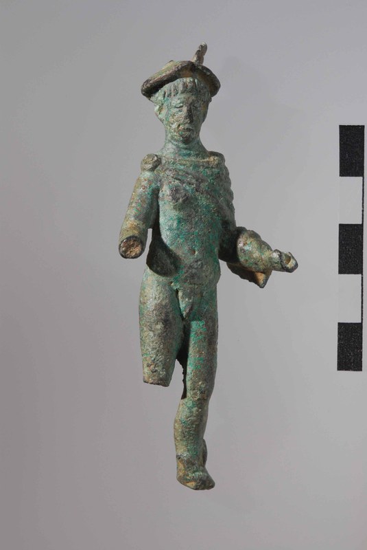 Römische Bronzestatuette des Merkur mit den typischen Attributen (Hut mit Flügeln, Mantel, geflügelte Schuhe). Ursprünglich trug er in der rechten Hand wohl einen Geldbeutel und in der linken den Hermesstab. Merkur wurde als Gott der Reisen und des Geschäftsglücks verehrt, sowie als Bote zwischen Göttern und Menschen, Lebenden und Toten. Ursprünglich dürfte die Statuette in einem Heiligtum (öffentlich oder privat) aufgestellt gewesen sein, ob sie in dieser Funktion oder erst als Altmetall auf die Baarburg gelangte, ist nicht bekannt (Tugium 25/2009)