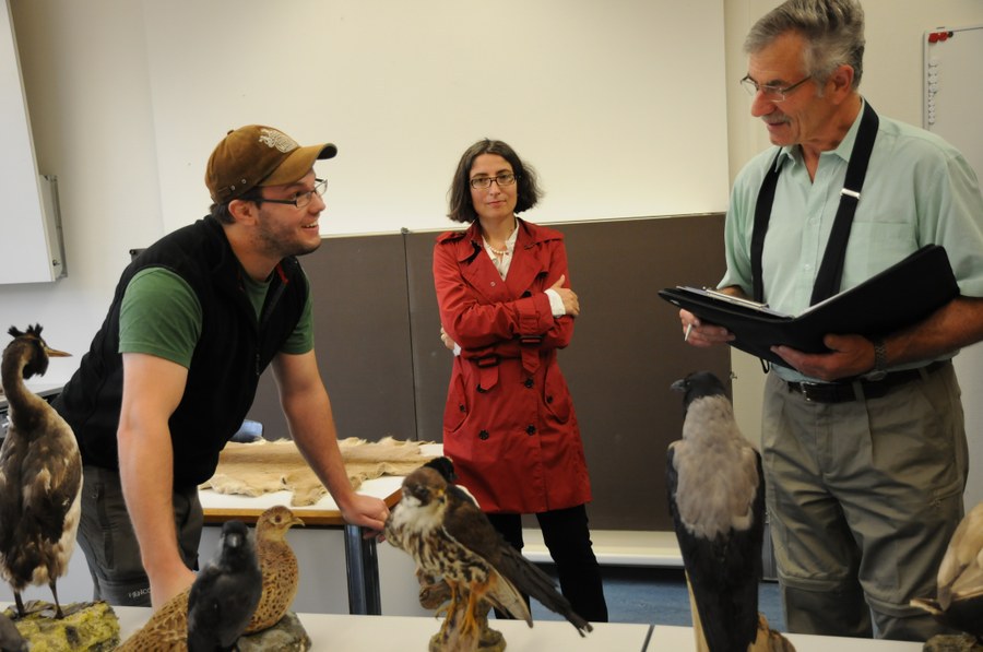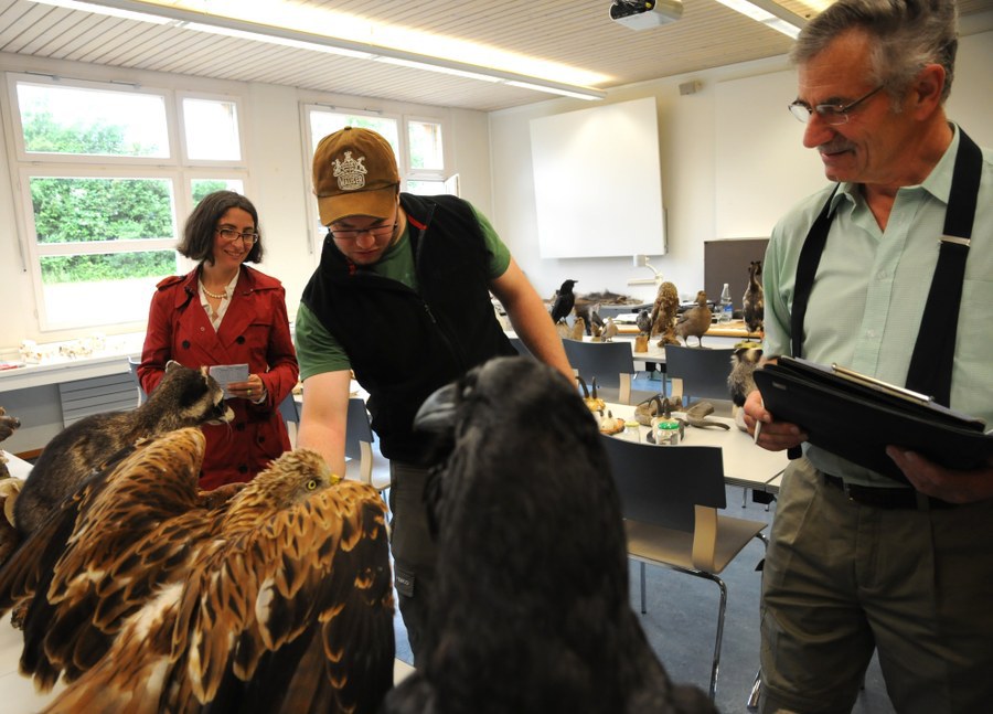 Foto 2: Prüfung im Fach Wildkunde, Vogelartenkenntnis. V.l.n.r. Jägerkandidat Michael Arnold, Regierungsrätin Weichelt-Picard und Prüfungsexperte Hans Häusler