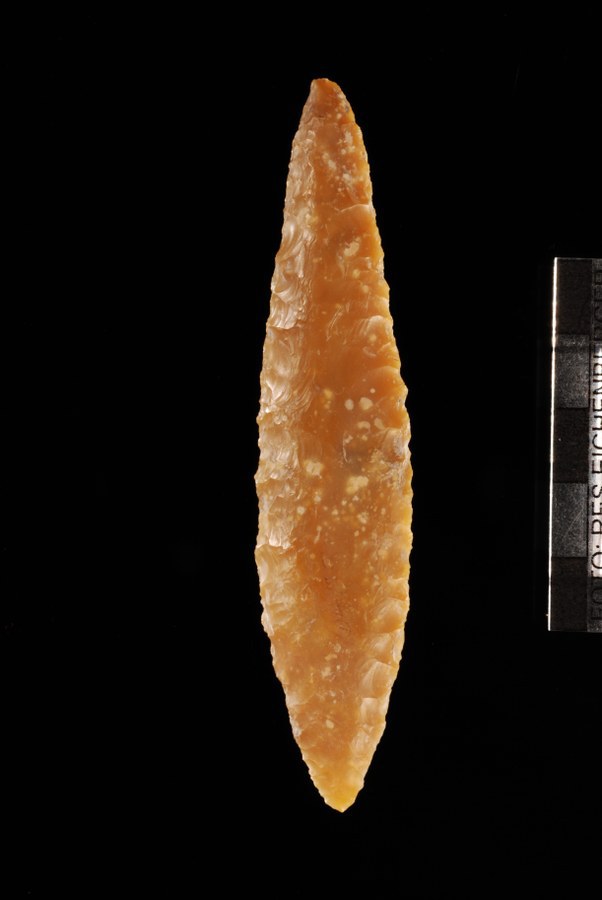 Der Feuerstein dieses prächtigen Dolchs stammt aus dem Pariser Becken und zeugt von weitreichenden Handelsbeziehungen in der Steinzeit.