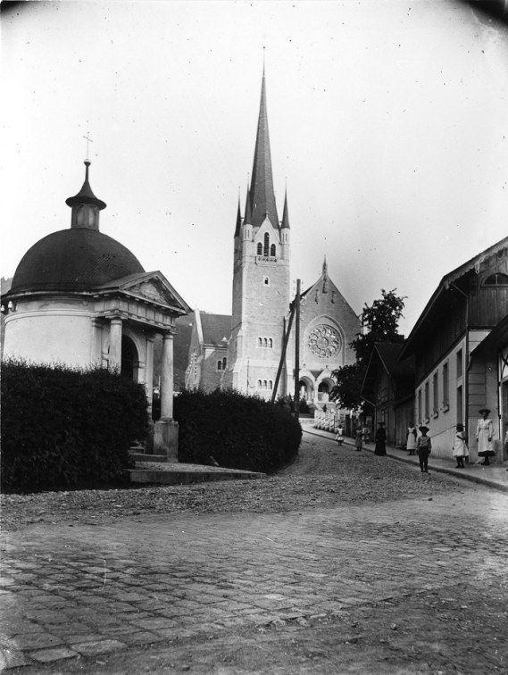 Wegkapelle St. Karl, im Hintergrund Kirche St. Michael (Postkarte, 1930)