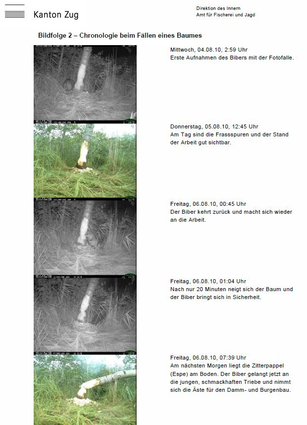 Ein Biber verrät seine Anwesenheit bereits eindeutig durch das hinterlassene Spurenbild. Zusätzlich wird der Nachweis mit den Fotofallen-Bildern der Direktion des Innern dokumentiert. "Man kann das Tier beim Fällen eines Baumes und beim Abtransport der Äste beobachten, ohne es zu stören. Von der Grösse her halte ich es für ein jüngeres Tier ", sagt der Wildhüter Ernst Suter. Das wäre dann durchaus auch typisch, denn Jungtiere müssen sich ein eigenes Territorium etablieren und besiedeln dabei neue Lebensräume. Natürlich nur dann, wenn die Population wächst und sich die Art ausbreitet.