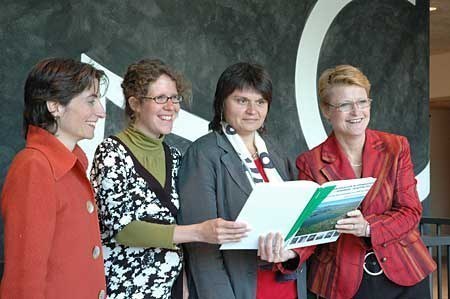 Im Rahmen der Buchvernissage überreichte Regierungsrätin Manuela Weichelt-Picard, Vorsteherin der Direktion des Innern (Bild links), den ersten Band der Gemeindepräsidentin Barbara Hofstetter (rechts); in der Bildmitte die beiden Projektleiterinnern Renata Huber und Brigitte Röder.