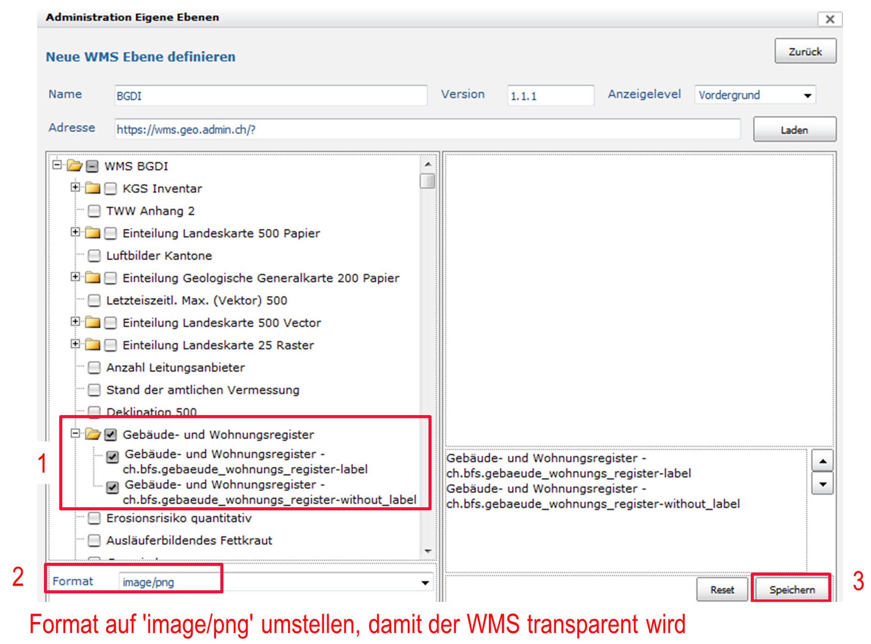 - Format ändern auf "image/png", damit der WMS transparent wird.