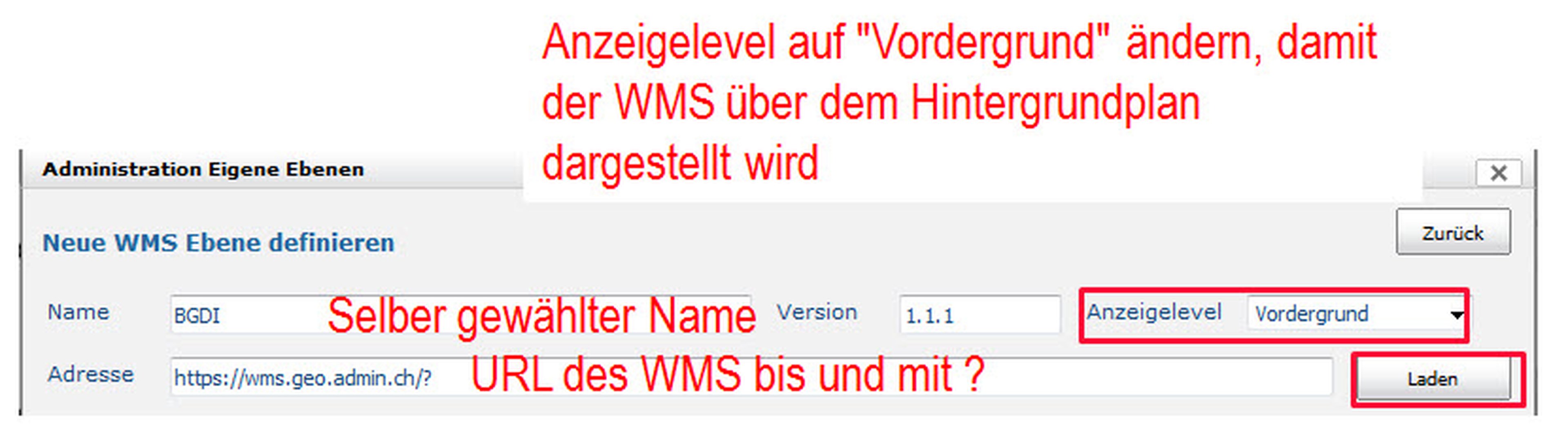 - URL eingeben (bis und mit ? z.B. https://wms.geo.admin.ch/?)
