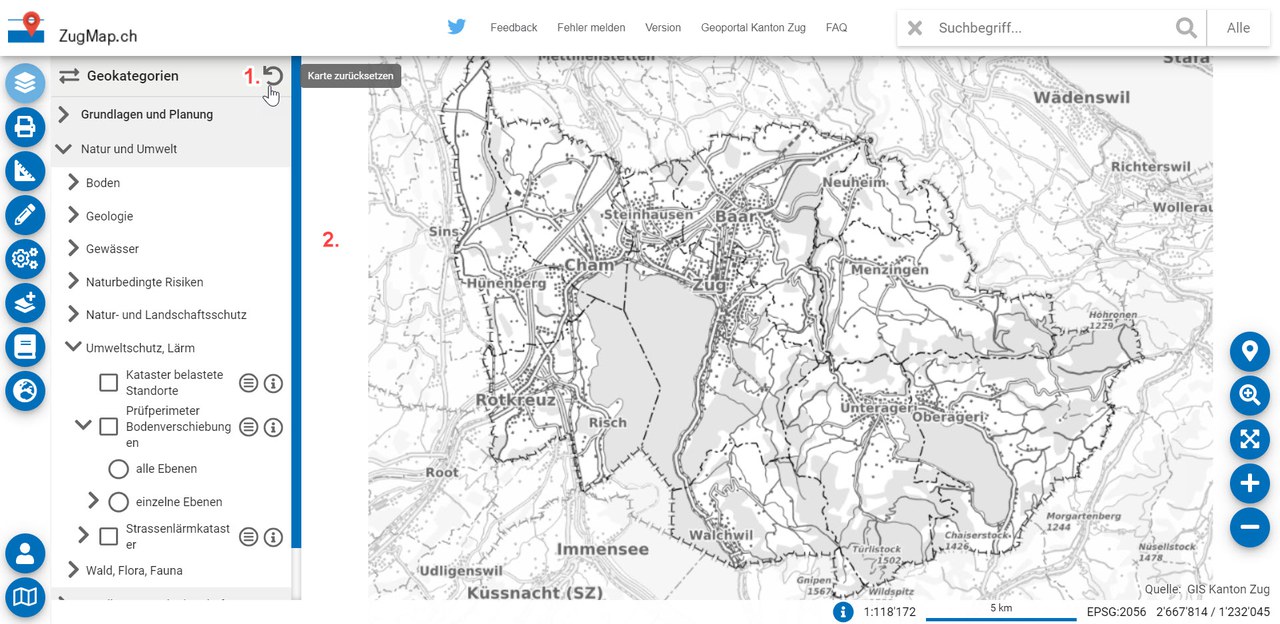 Dargestellte Themen entfernen mit dem Knopf "Karte zurücksetzen" in der Kartenlegende.
