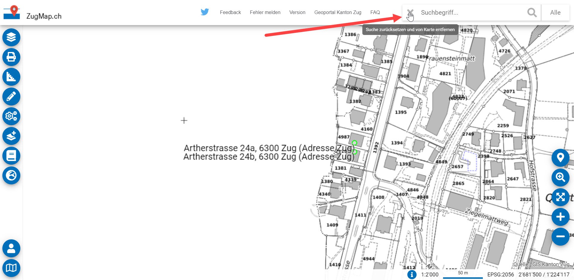 Suchresultat in der Karte von ZugMap entfernen mit einem Klick auf das Kreuz im Suchfenster.