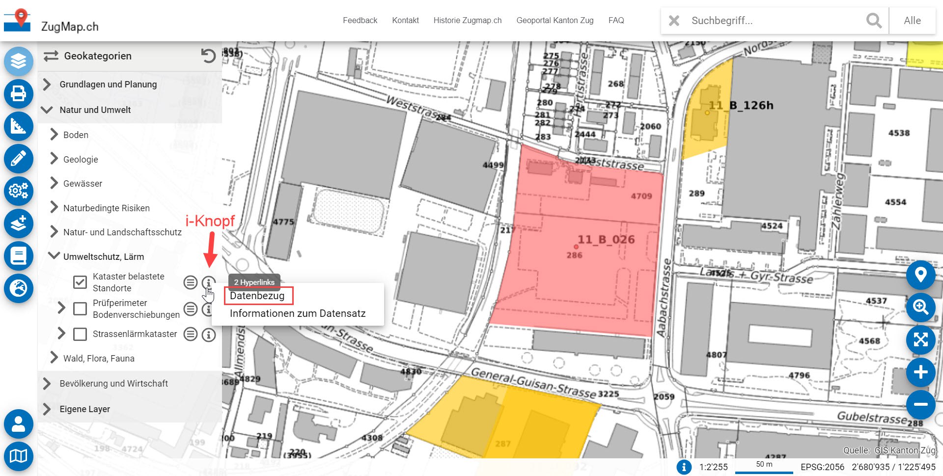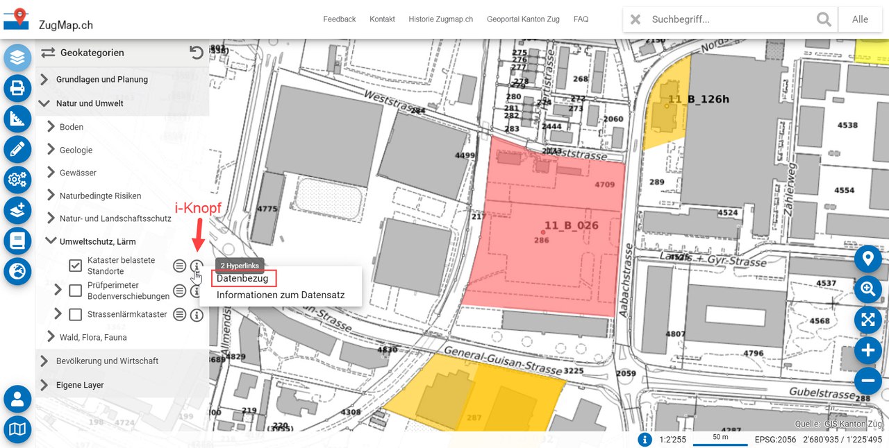 Datenbezug von verschiedenen Geodatenformate in ZugMap via i-Knopf beim jeweiligen Thema.