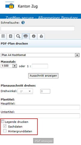 Nein, die Funktion "Legende drucken" funktioniert im ZugMap.secure noch nicht. Die Funktion "Legende drucken" gibt es im ZugMap.ch nicht.