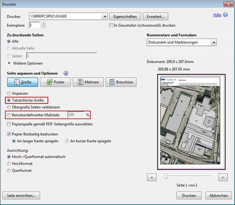 Soll der Papierausdruck im gewählten Massstab sein, muss im Druckdialog Ihres Druckers beim Thema Seiteneinpassung "Keine Skalierung", "Tatsächliche Grösse" oder "Benutzerdefinierter Massstab 100%" ...
