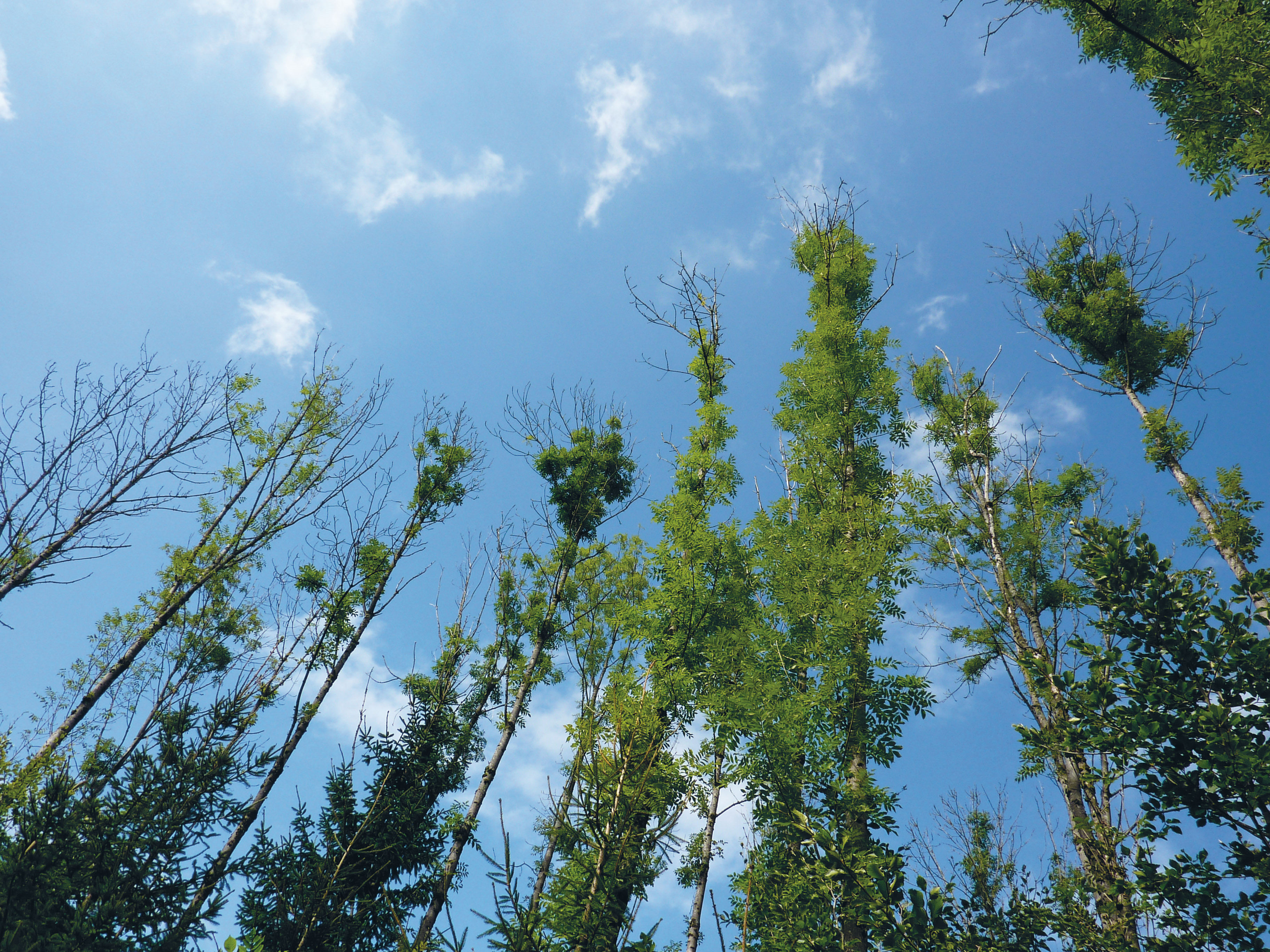 Von Pilzsporen befallene Eschenbäume. Triebe können nur noch ungenügend mit Wasser und Nährstoffen versorgt werden und sterben darum ab. Foto: Eidgenössische Forschungsanstalt für Wald, Schnee und Landschaft (WSL).