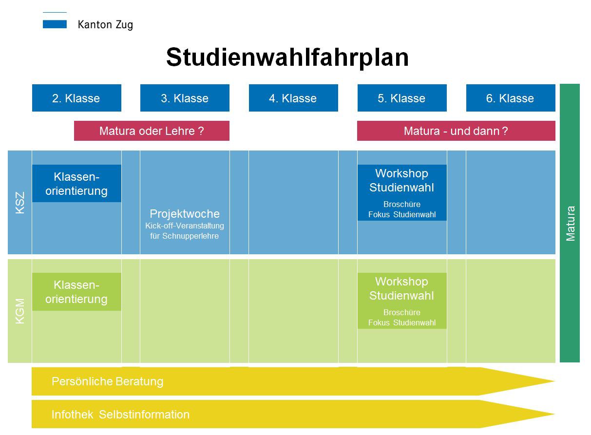 Im Jahr vor der Maturität werden an den Kantonsschulen Zug und Menzingen zwei obligatorische Workshops zur Studienwahlvorbereitung durchgeführt. In diesen Workshops befassen sich die Schülerinnen und Schüler mit ihren Interessen, Stärken, Werthaltungen und ihren Studien- und Berufswünschen. Sie erhalten Tipps und Anregungen, wie sie ihre Studienwahl erfolgreich anpacken können und die Gelegenheit zu gezielten Recherchen im BIZ. Es werden erste relevante Informationen zu Studium und Beruf vermittelt.