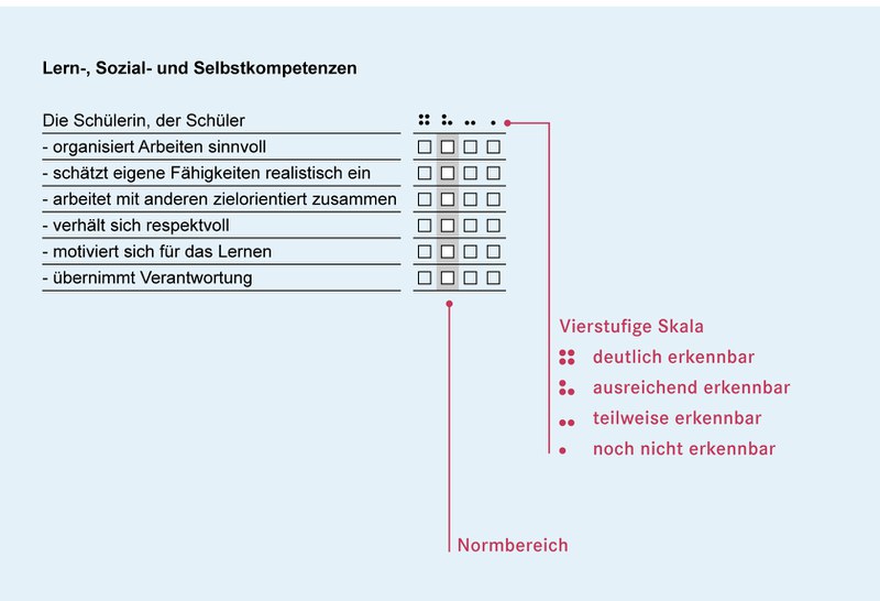 Im Zeugnis sowie in den Beobachtungs- und Beurteilungsunterlagen ist für die Erfüllung der Lernziele in den Lern-, Sozial- und Selbstkompetenzen «ausreichend erkennbar» (• • •) als Normbereich definiert. Darunter wird der Regelfall, d. h. das üblicherweise erwartete Verhalten verstanden. Die entsprechende Spalte ist bei den Lernzielen grau hinterlegt.
