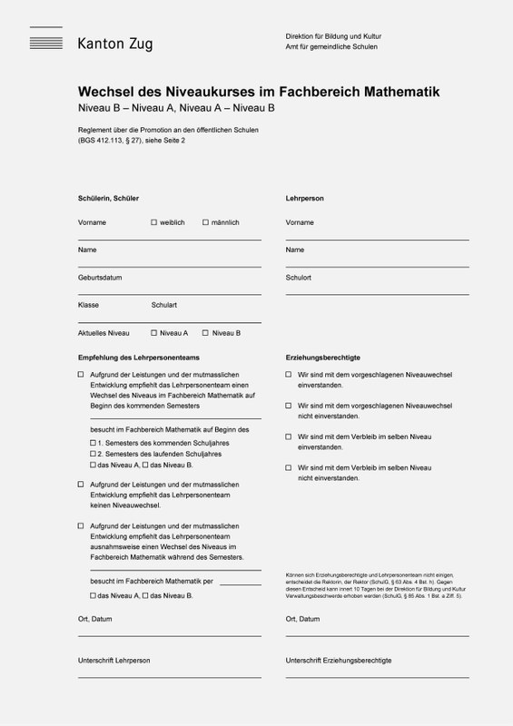 Im Promotionsreglement sind für den früheren Wechsel der Niveaukurse keine klar definierten Termine und keine Rahmenbedingungen zur Zeugniserstellung festgehalten. Um dennoch eine einheitliche Praxis im Kanton Zug zu etablieren, sind von kantonaler Seite her folgende Empfehlungen wegleitend:
