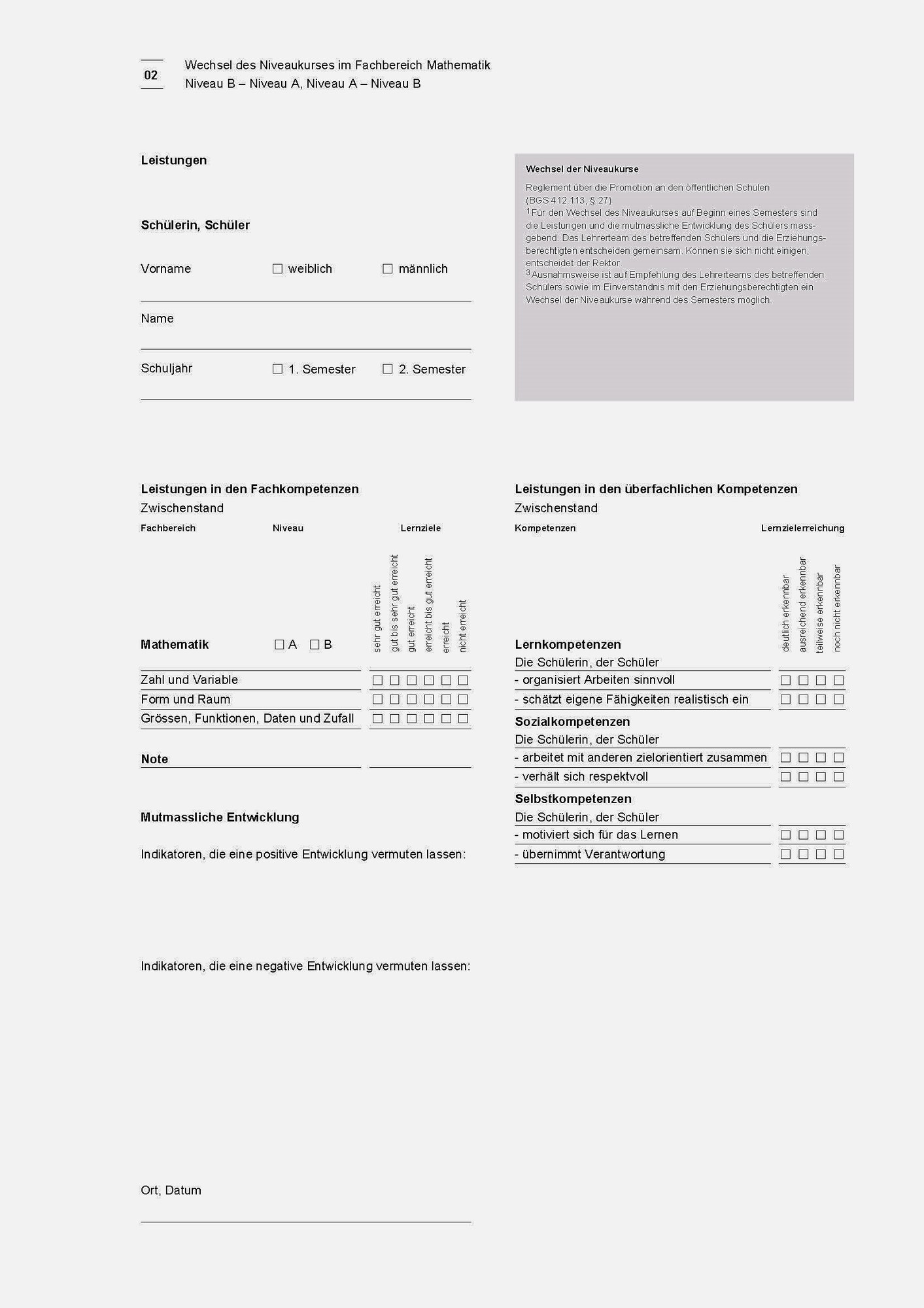 In der Regel werden Wechsel der Niveaukurse auf Beginn des Semesters vollzogen. Grundlage für diesen Wechsel ist das Formular «Wechsel des Niveaukurses», welches in LehrerOffice oder im Internet abrufbar ist.