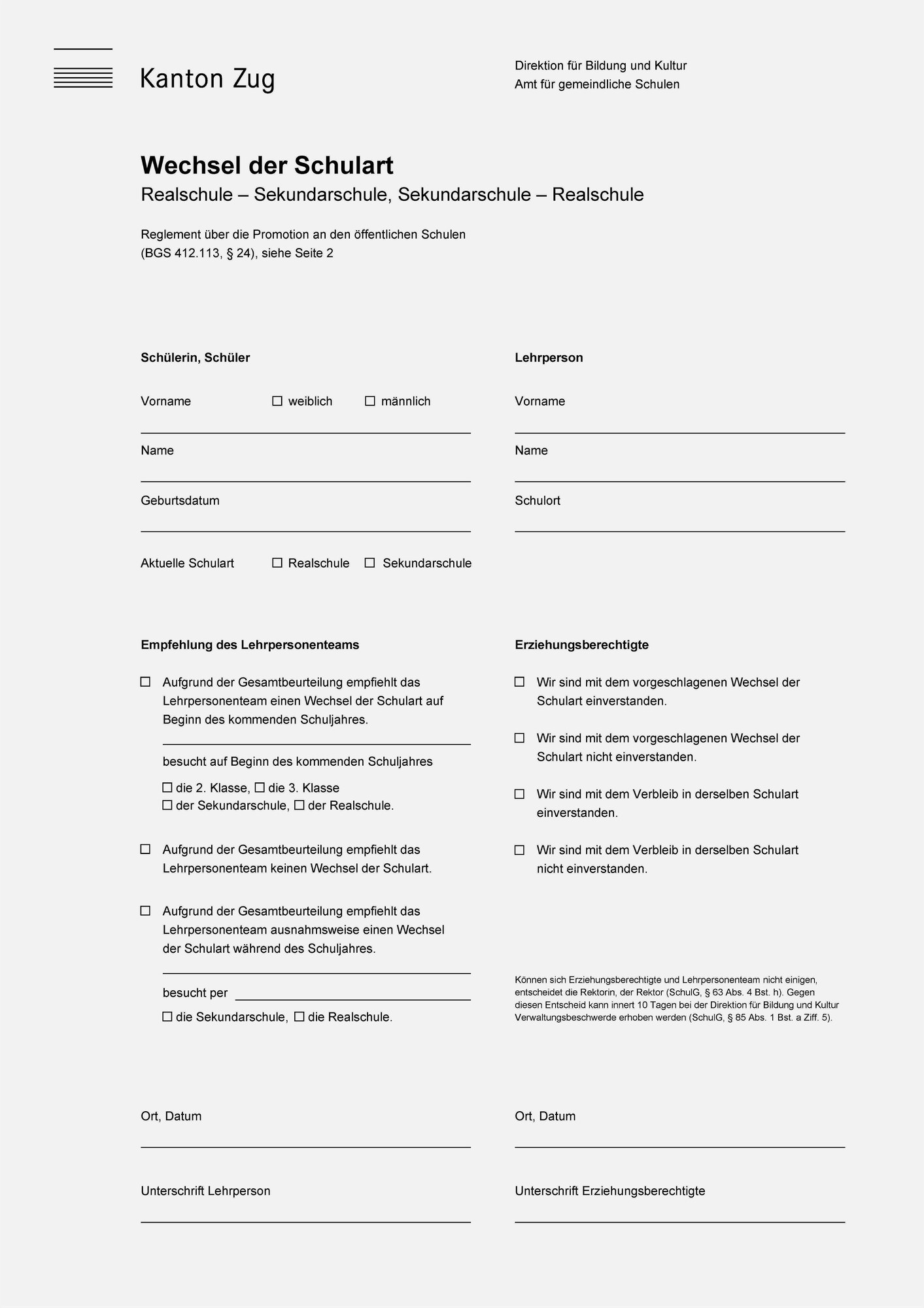 Im Promotionsreglement sind für den früheren Schulartenwechsel keine klar definierten Termine und keine Rahmenbedingungen zur Zeugniserstellung festgehalten. Um dennoch eine einheitliche Praxis im Kanton Zug zu etablieren, sind von kantonaler Seite her folgende Empfehlungen wegleitend: