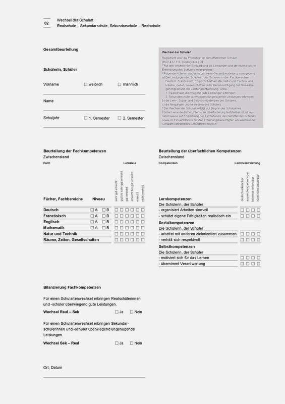 Sofern eine deutliche Unter- oder Überforderung feststellbar ist, ist ausnahmsweise auf Empfehlung des Lehrpersonenteams sowie im Einverständnis mit den Erziehungsberechtigten ein Wechsel der Schulart während des Schuljahres möglich. Grundlage für diesen Wechsel ist das Formular «Wechsel der Schulart», welches in LehrerOffice oder im Internet abrufbar ist.