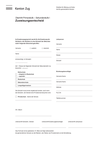| 6. Klasse Primarstufe: Formular «Zuweisungsentscheid» Deutsch |