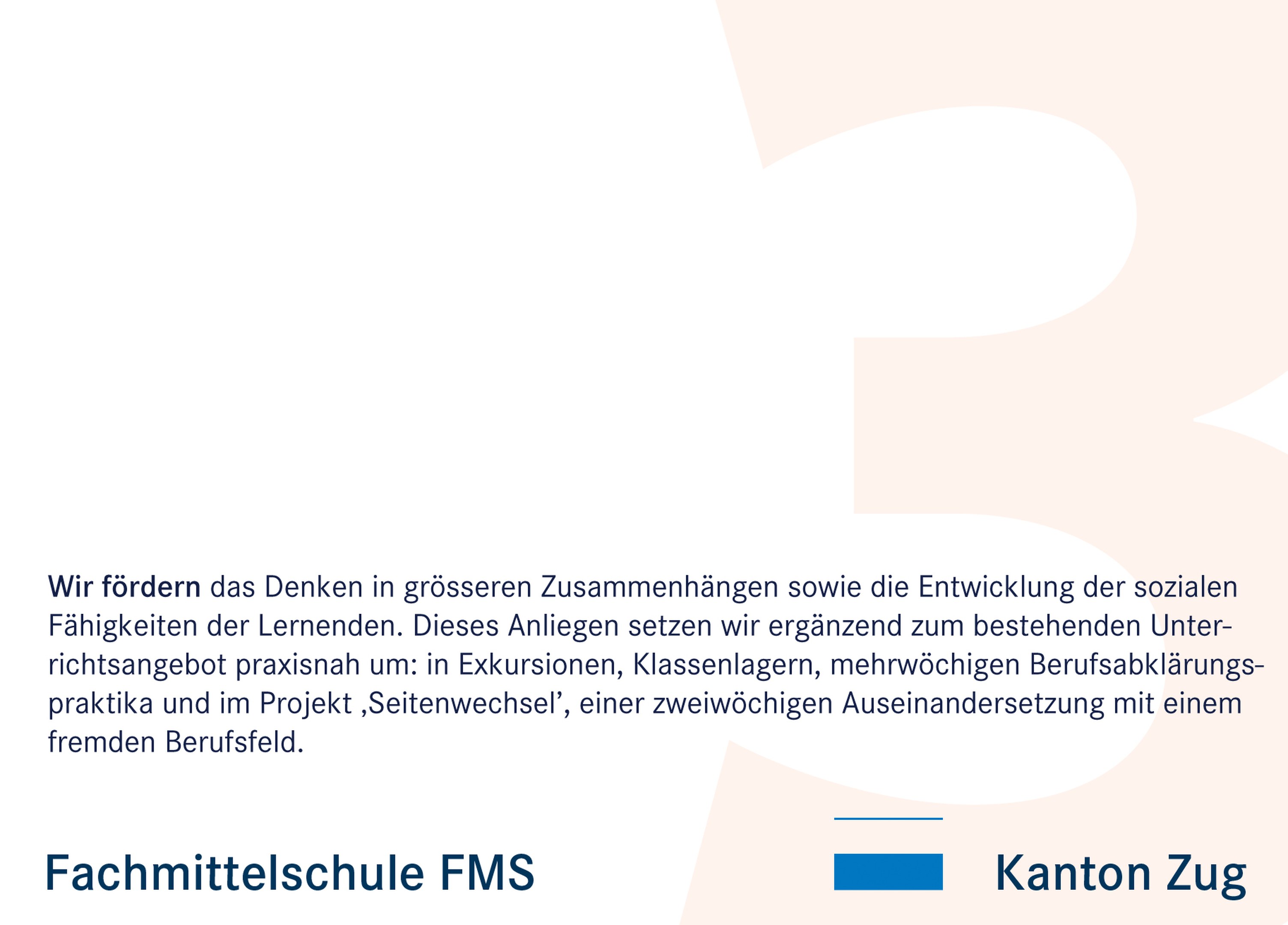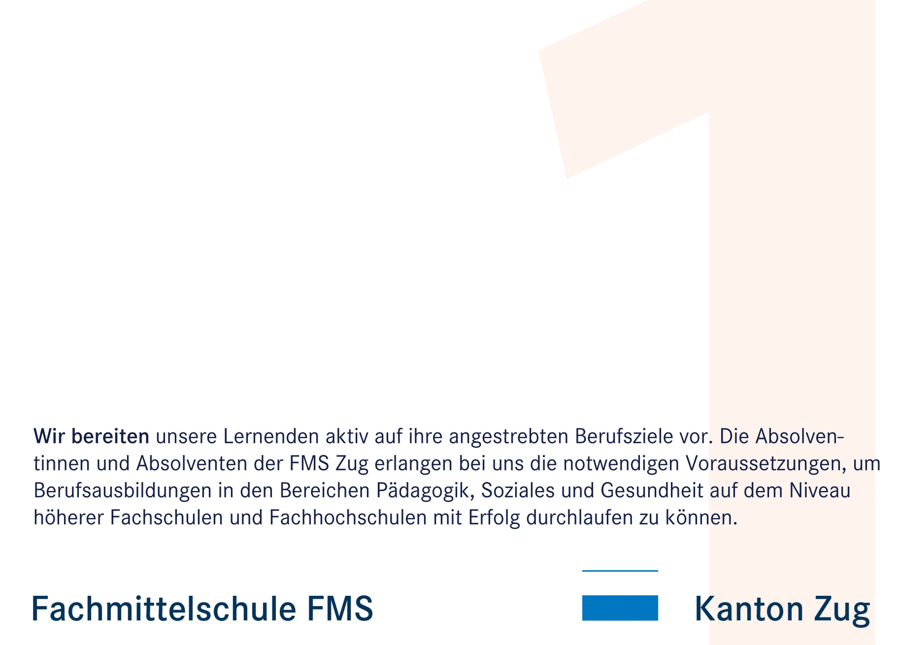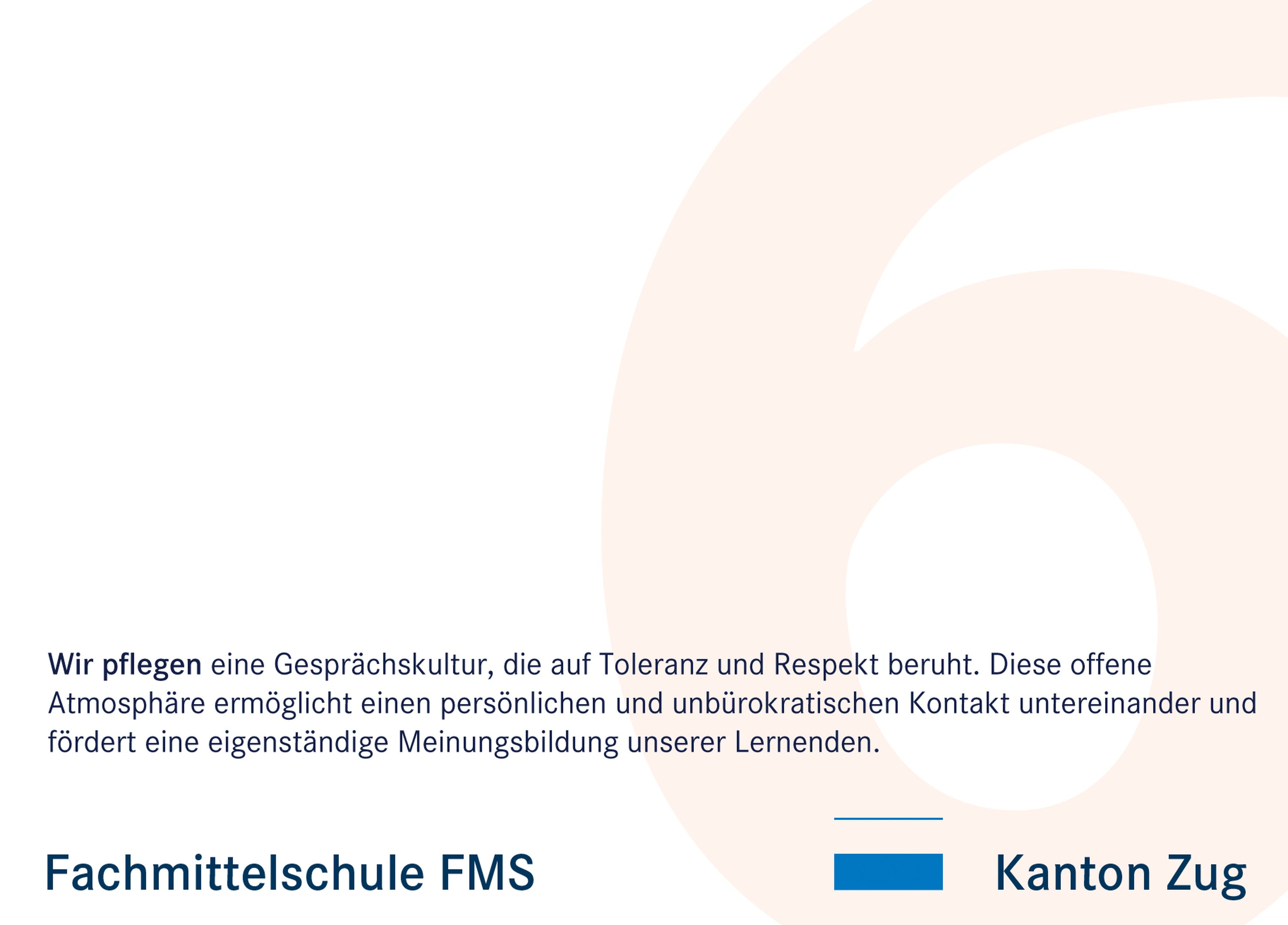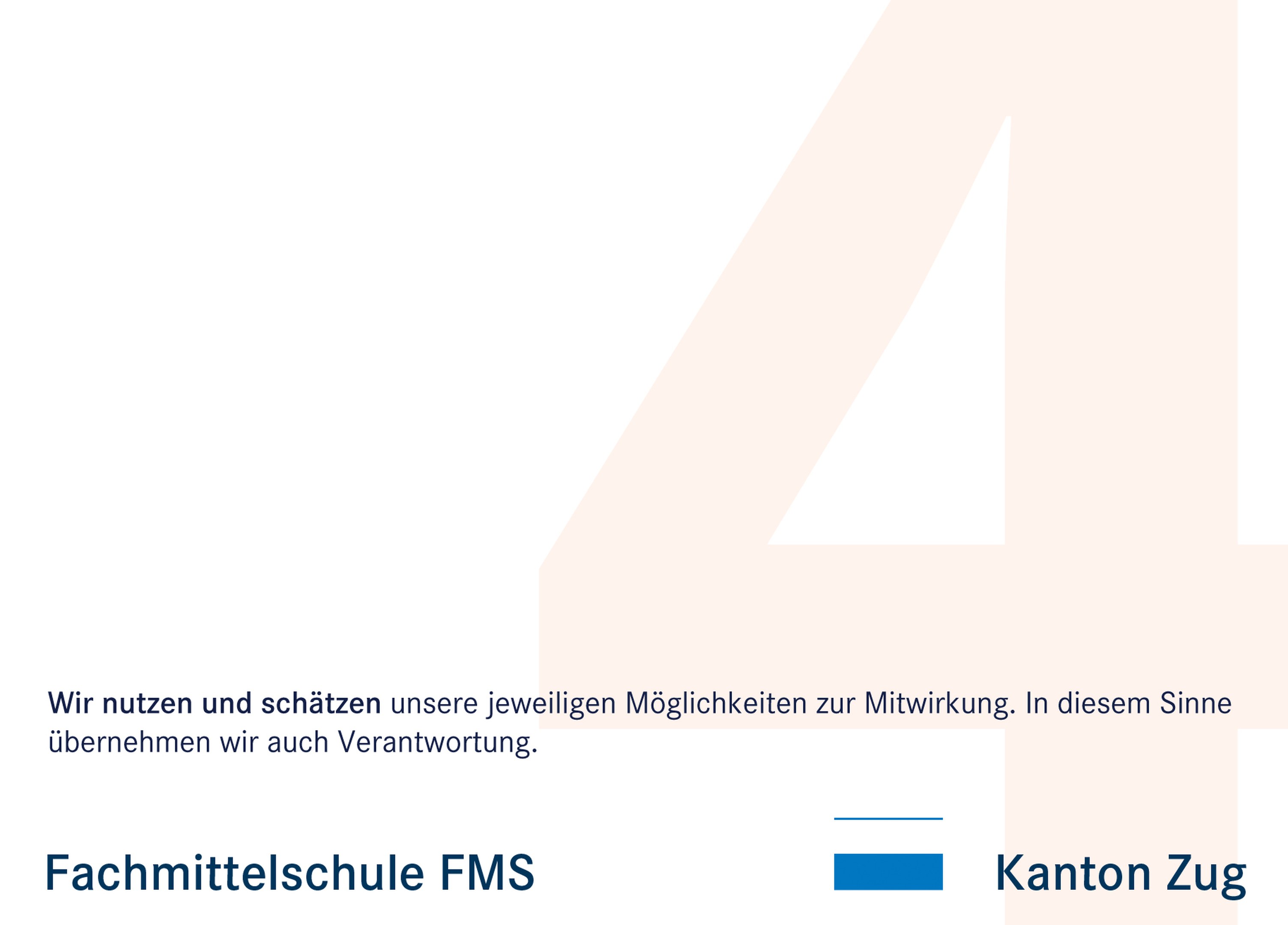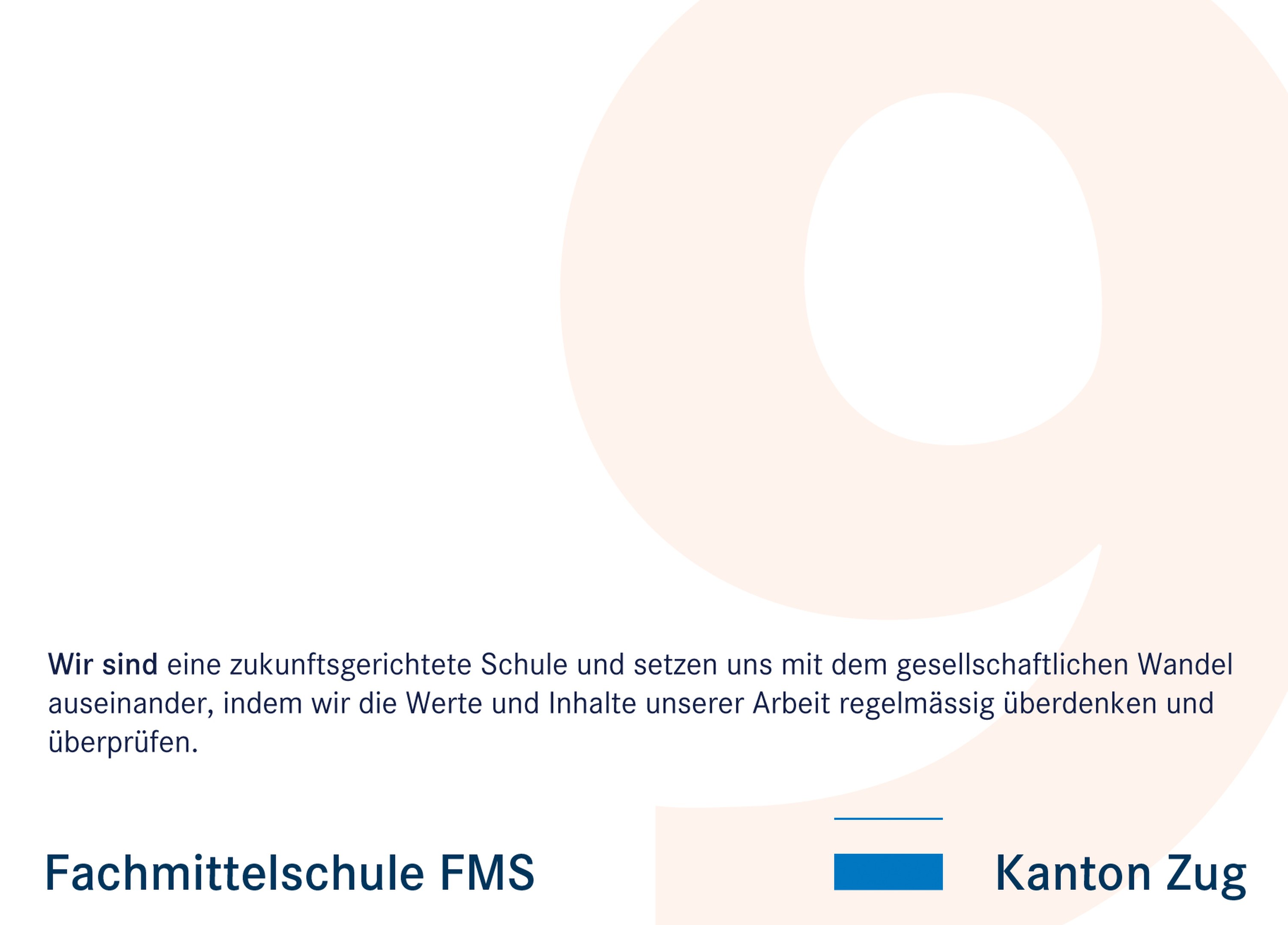 Bei der FMS Zug stehen die Lernenden im Mittelpunkt. Dazu gehört nicht nur das zeitgemässe Vermitteln von Bildungszielen, sondern auch die Unterstützung bei der Entwicklung einer eigenen, starken Persönlichkeit. Um das zu erreichen, haben wir uns als Schule in Form von Leitideen entsprechende Ziele gesetzt.