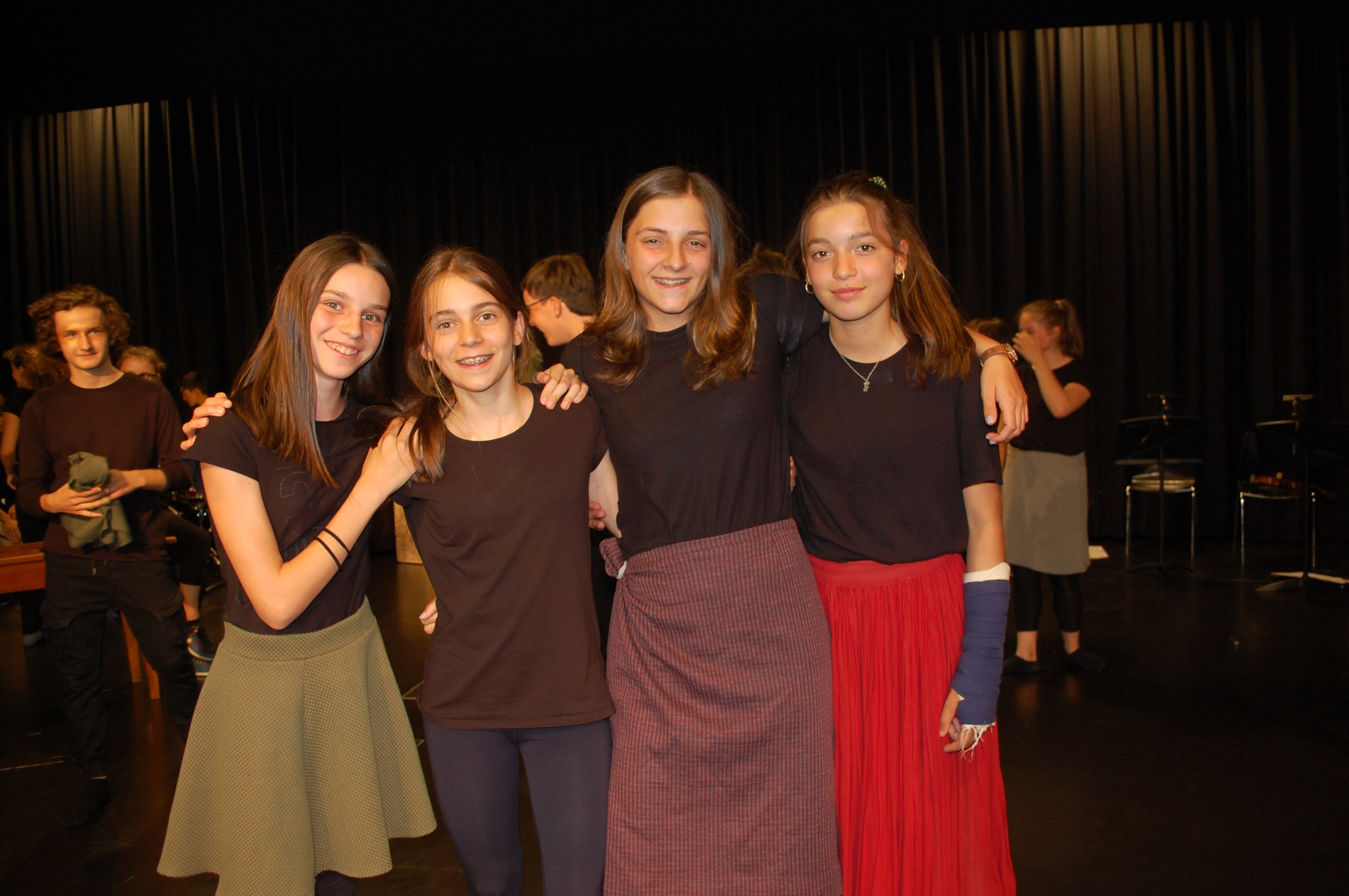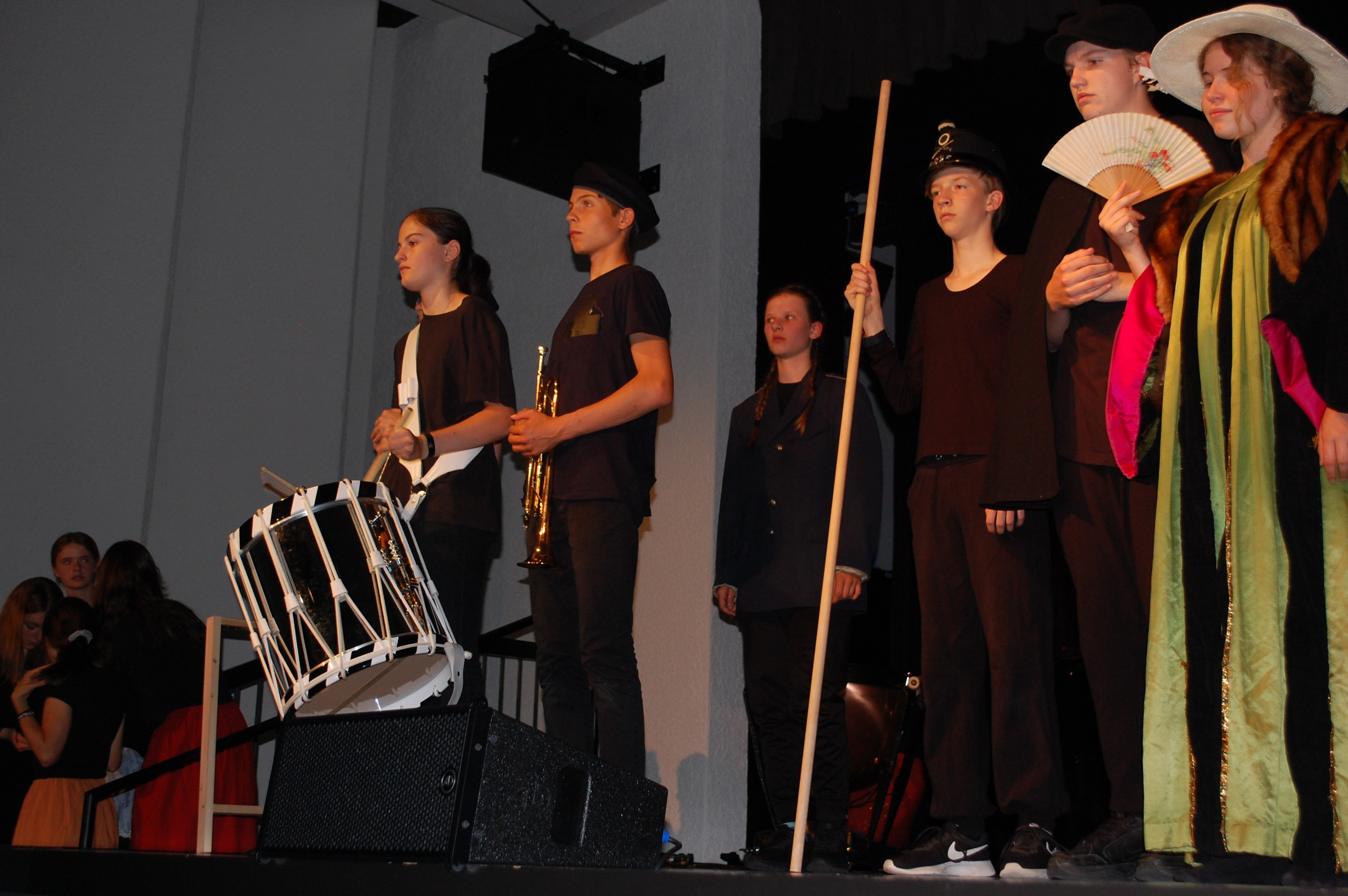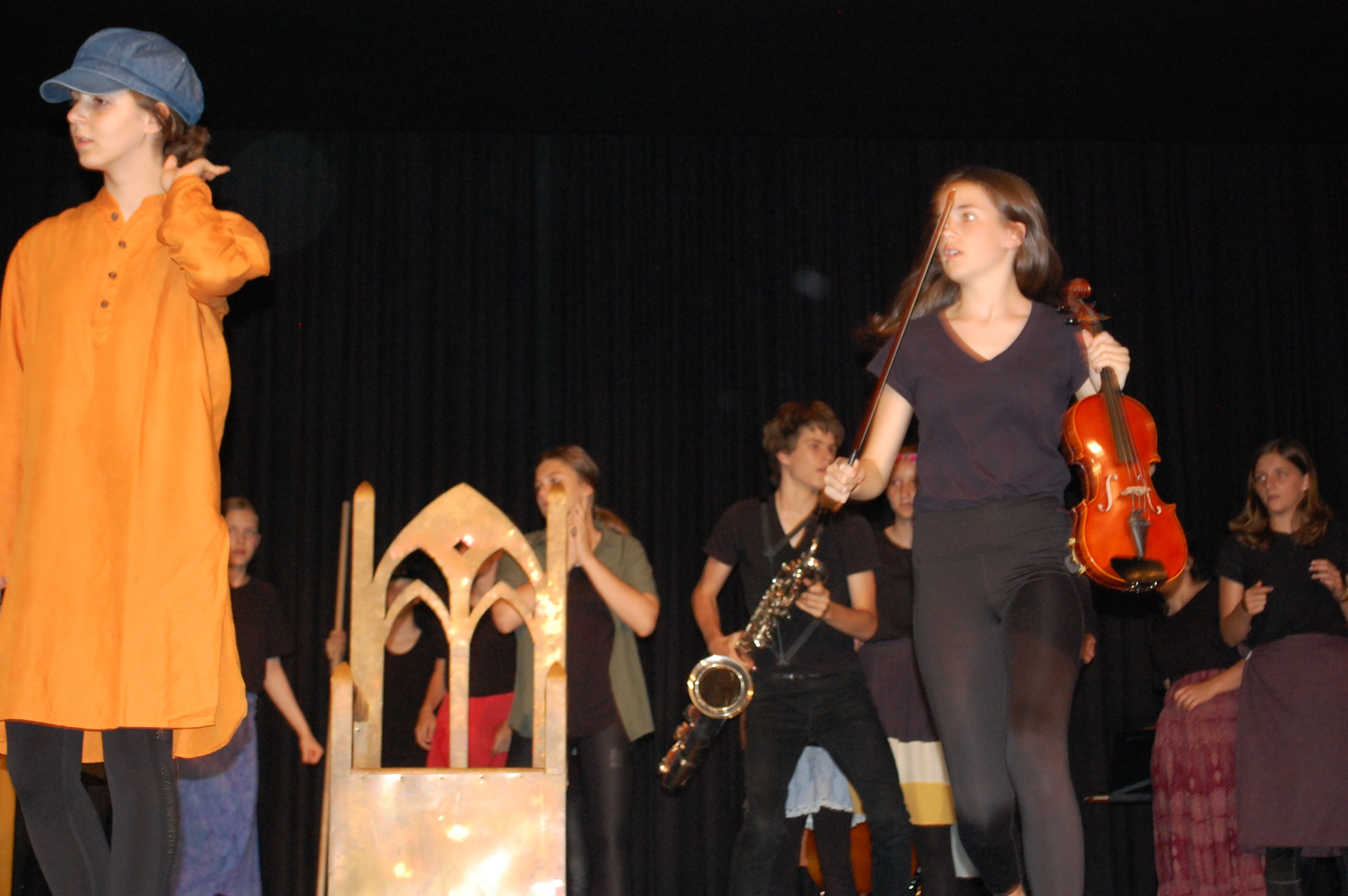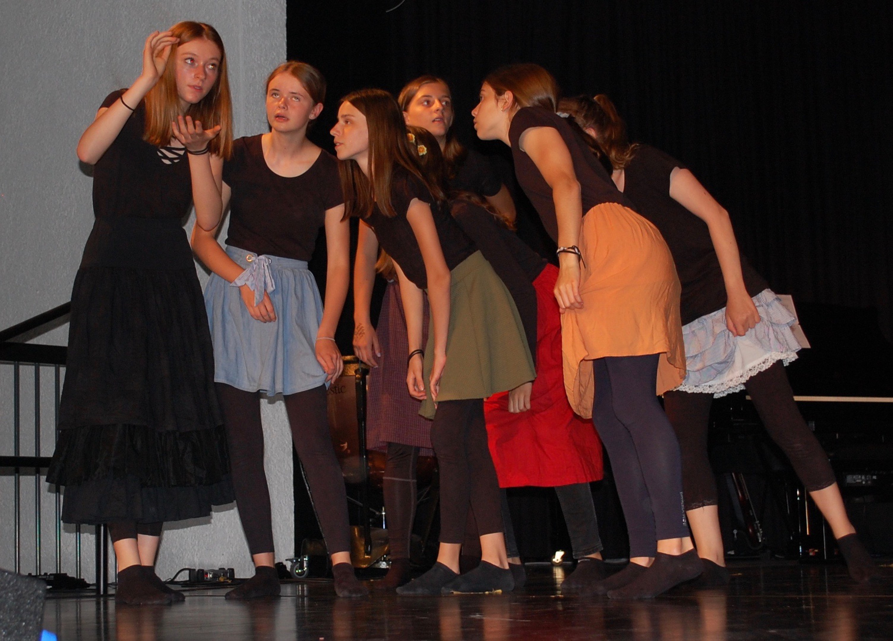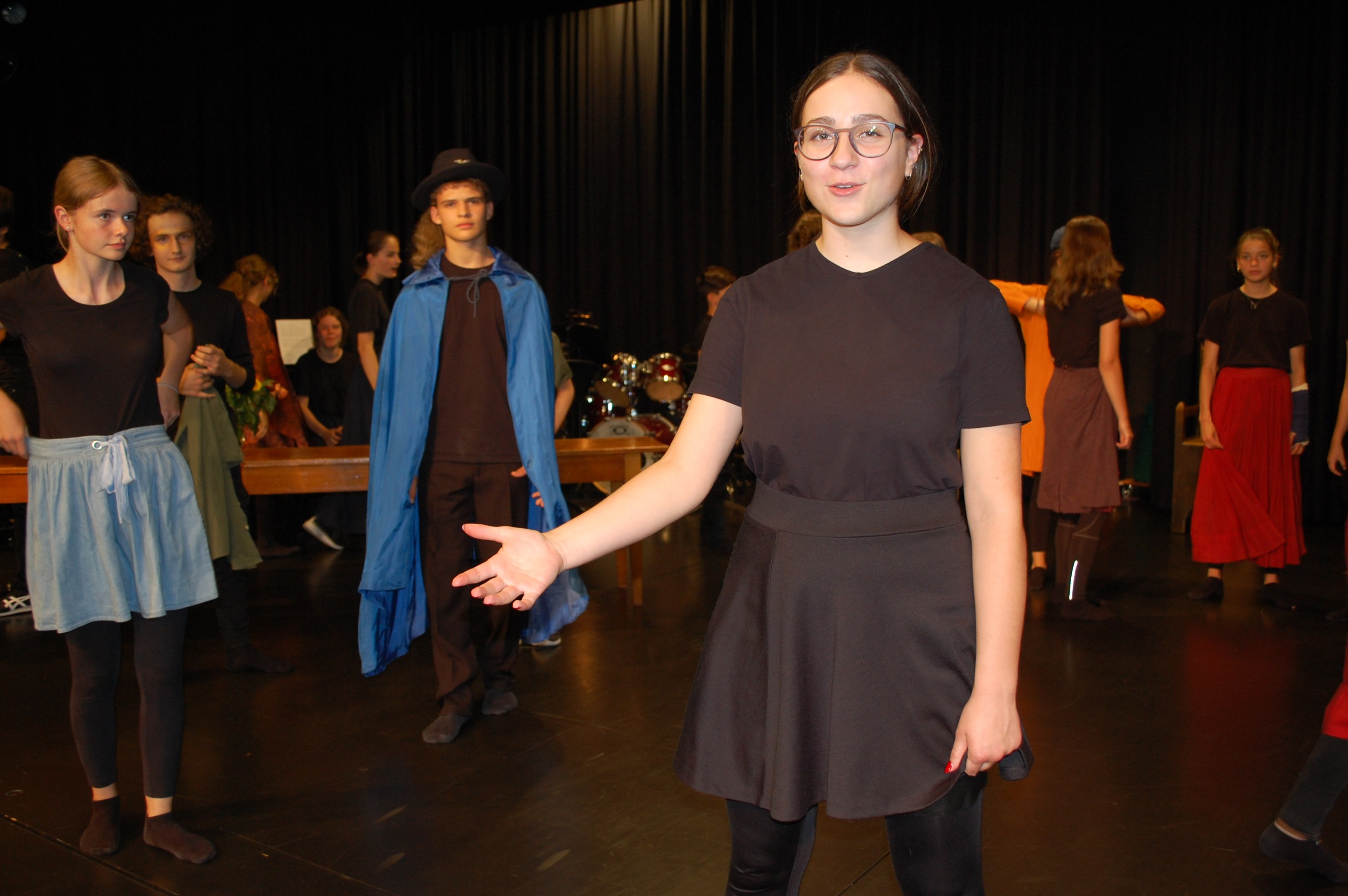 Am Montagmorgen der Sonderwoche »Musisches Projekt« kannten (fast) alle 40 Beteiligten ihre Rolle auswendig. Sie wussten, am Donnerstagabend würde die Aufführung stattfinden. Bis dahin musste die Rockband, das Streichquartett, das dreistimmige Lied, die Choreographie des Tanzes, die Masken, die Kleider, das ganze 5/4-stündige Theater bereit sein. Ohne Verstärkung und das in der grossen Aula.