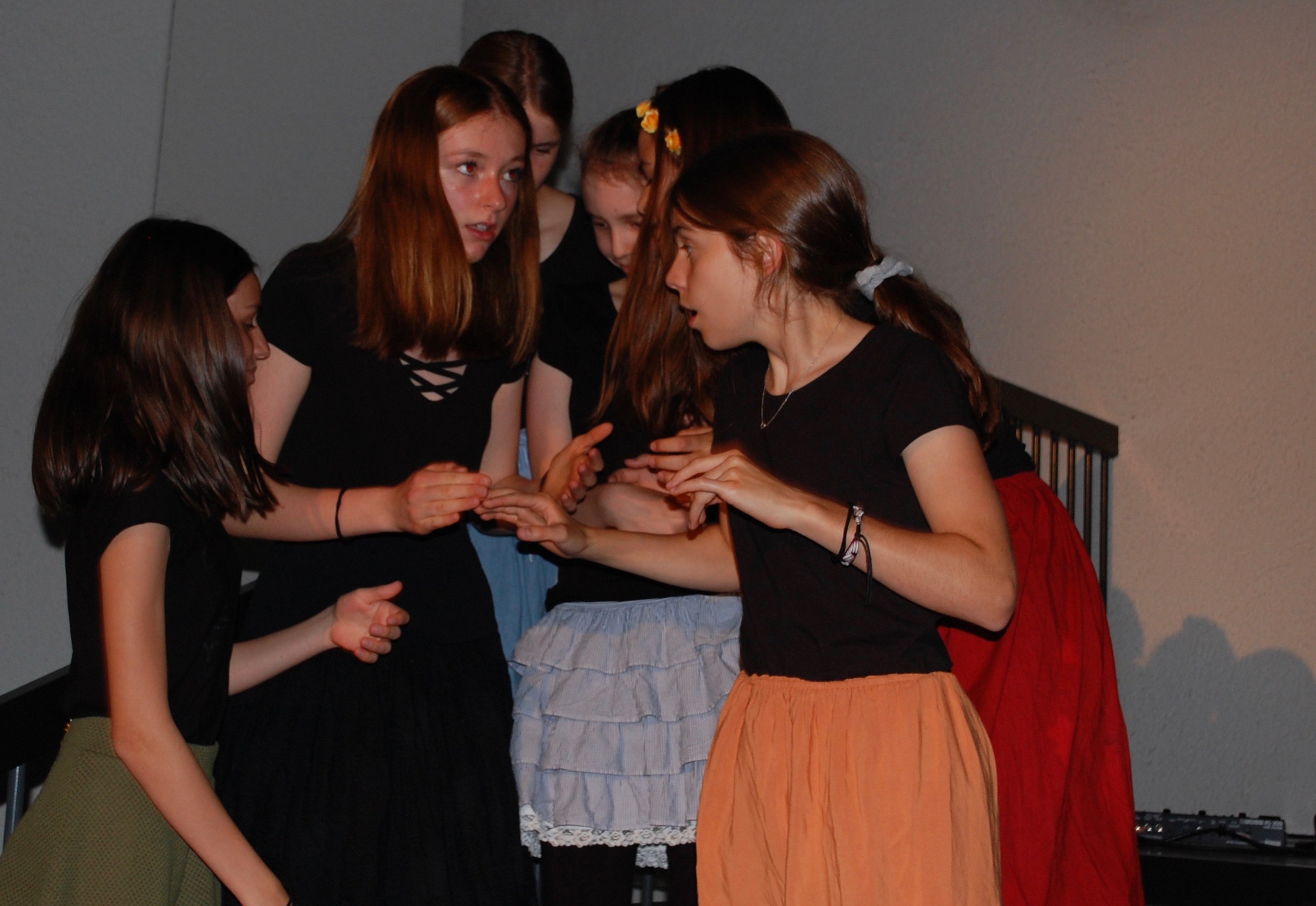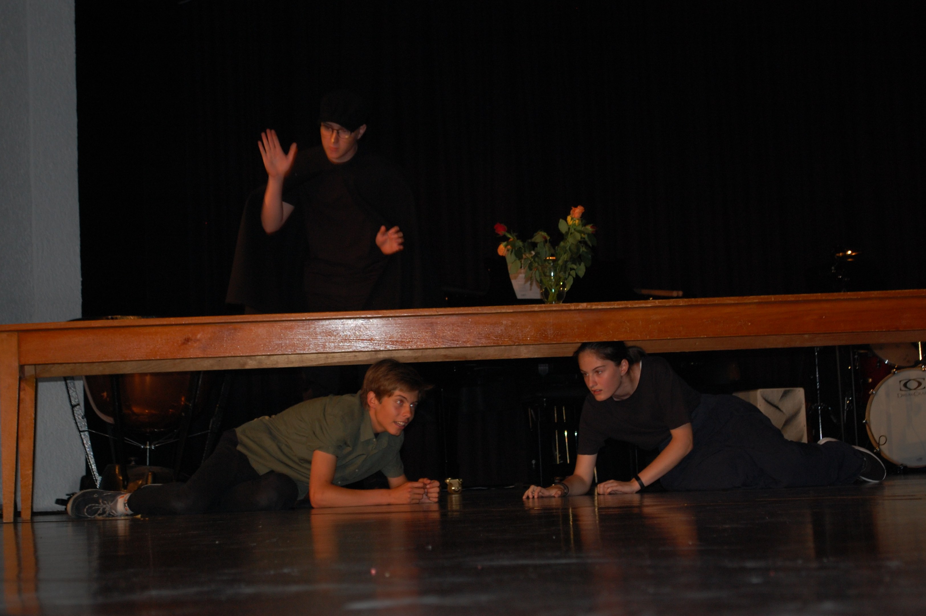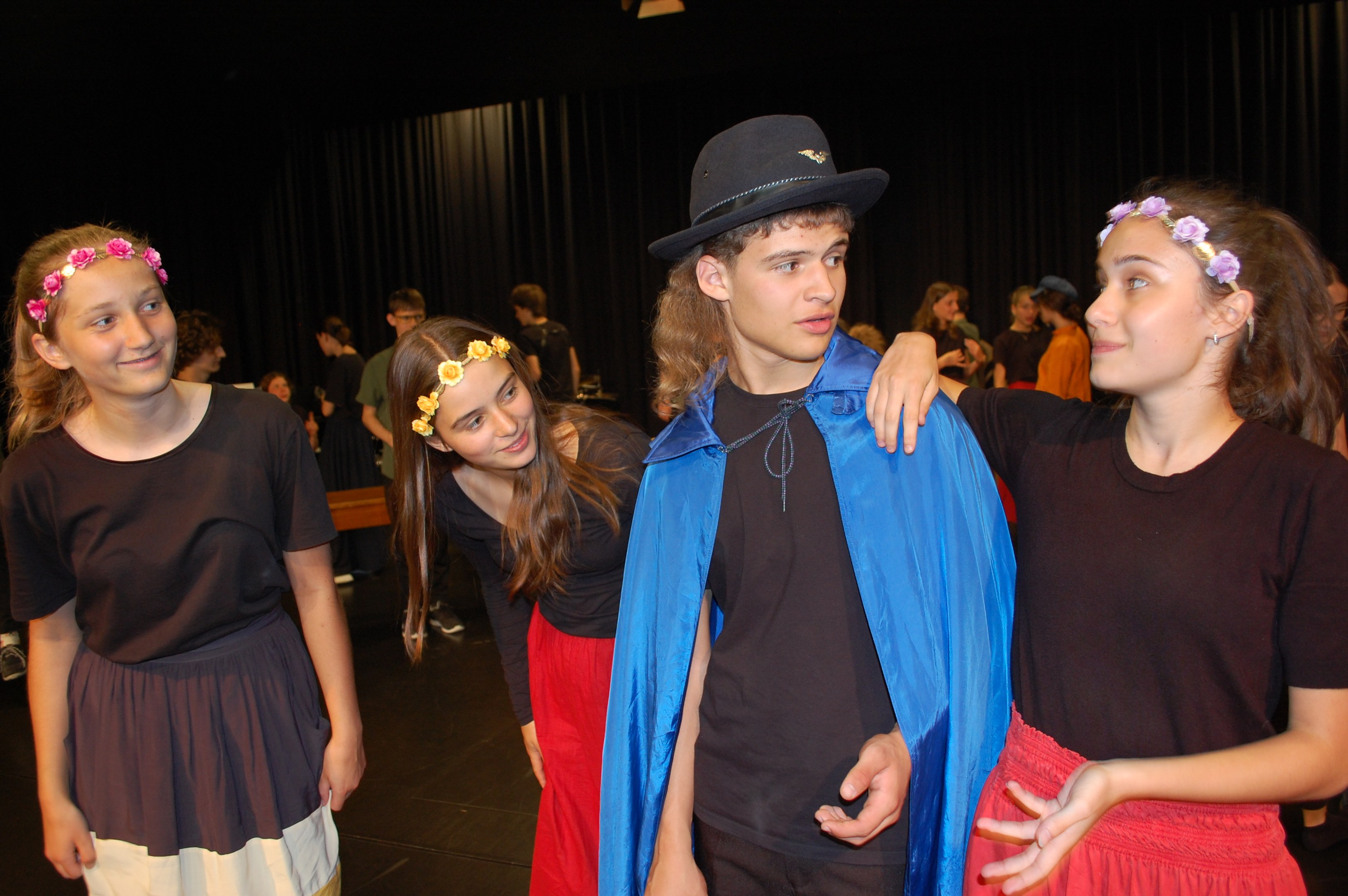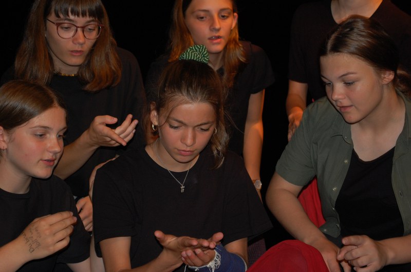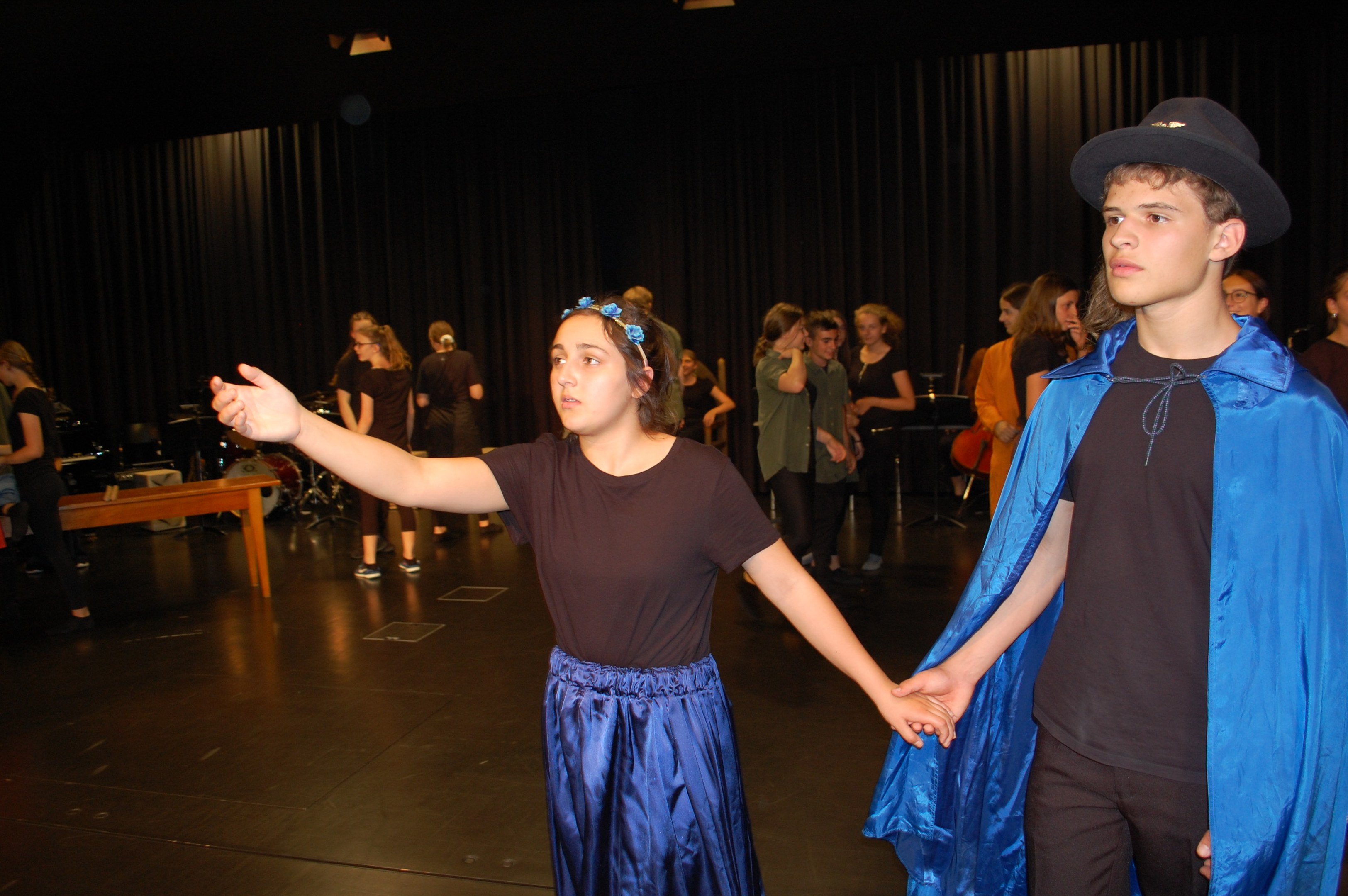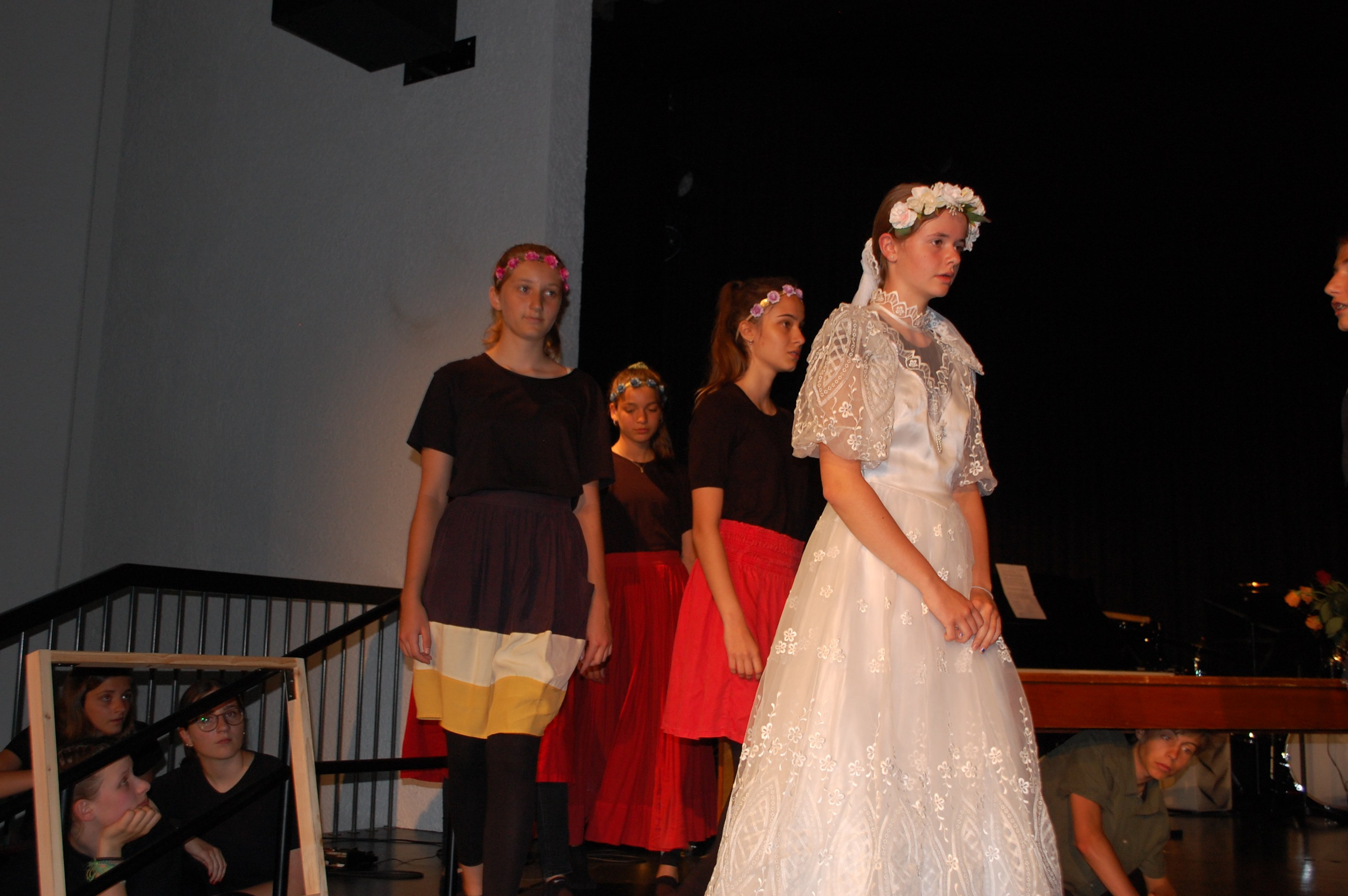 Am Montagmorgen der Sonderwoche »Musisches Projekt« kannten (fast) alle 40 Beteiligten ihre Rolle auswendig. Sie wussten, am Donnerstagabend würde die Aufführung stattfinden. Bis dahin musste die Rockband, das Streichquartett, das dreistimmige Lied, die Choreographie des Tanzes, die Masken, die Kleider, das ganze 5/4-stündige Theater bereit sein. Ohne Verstärkung und das in der grossen Aula.