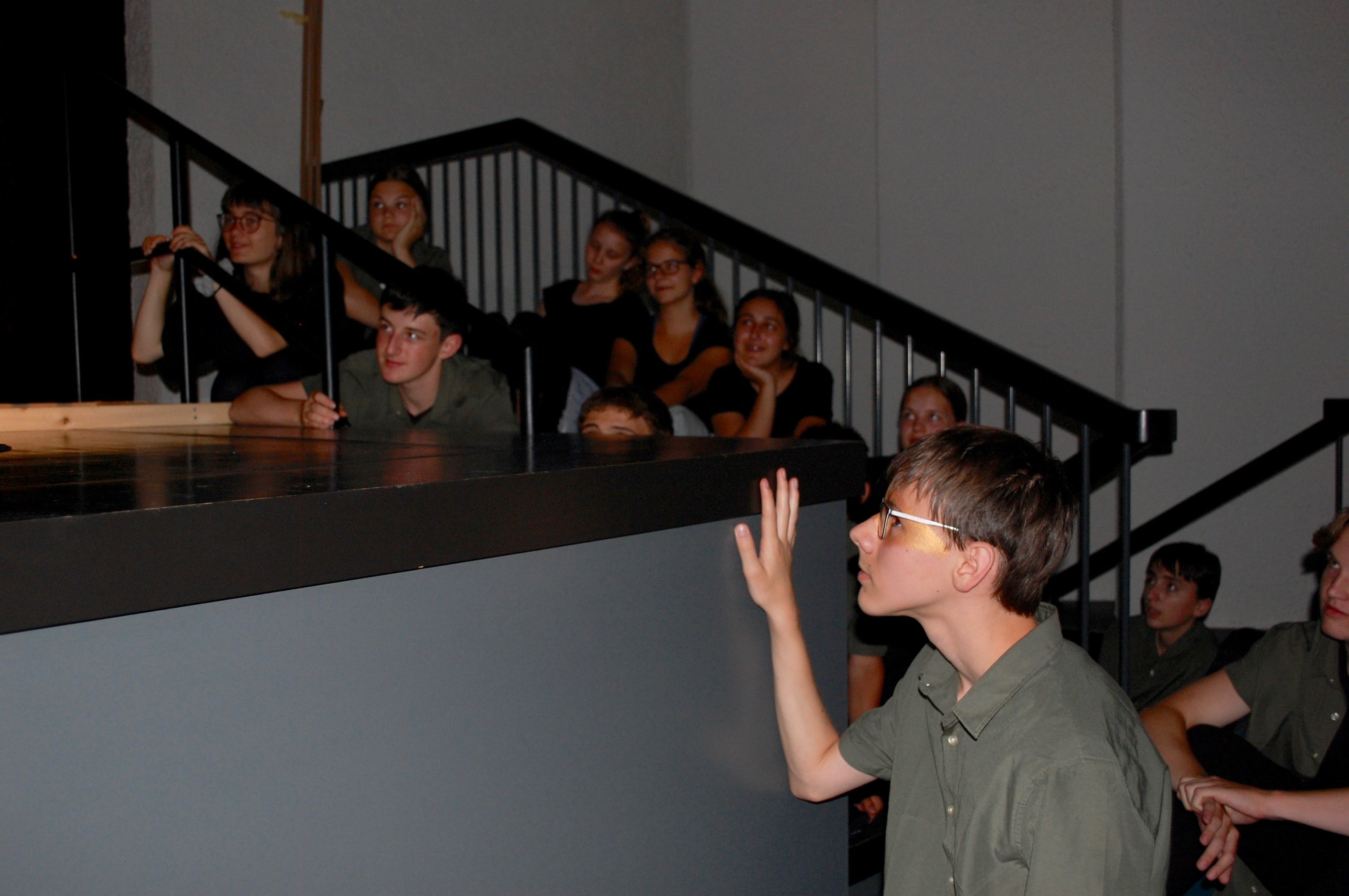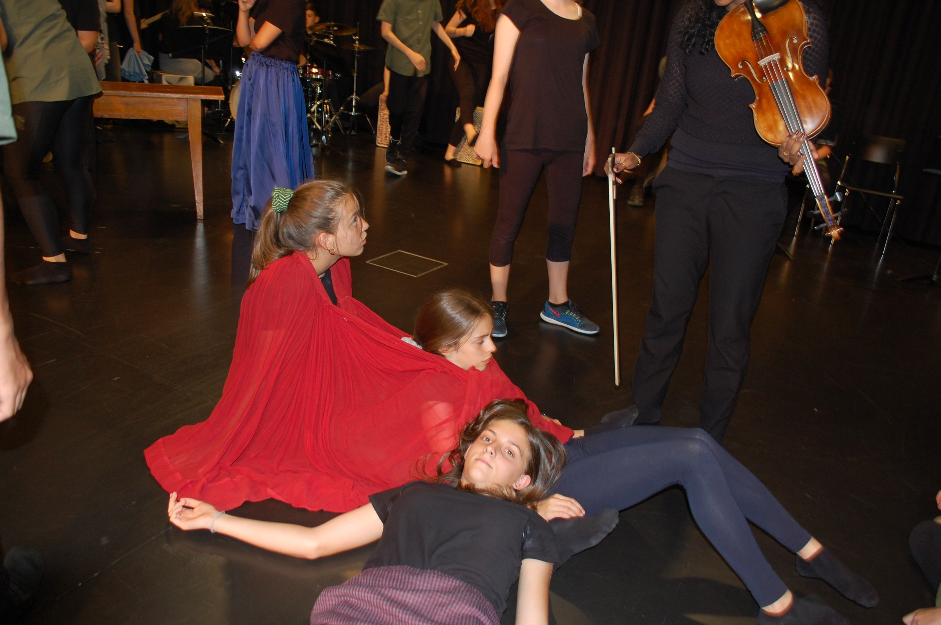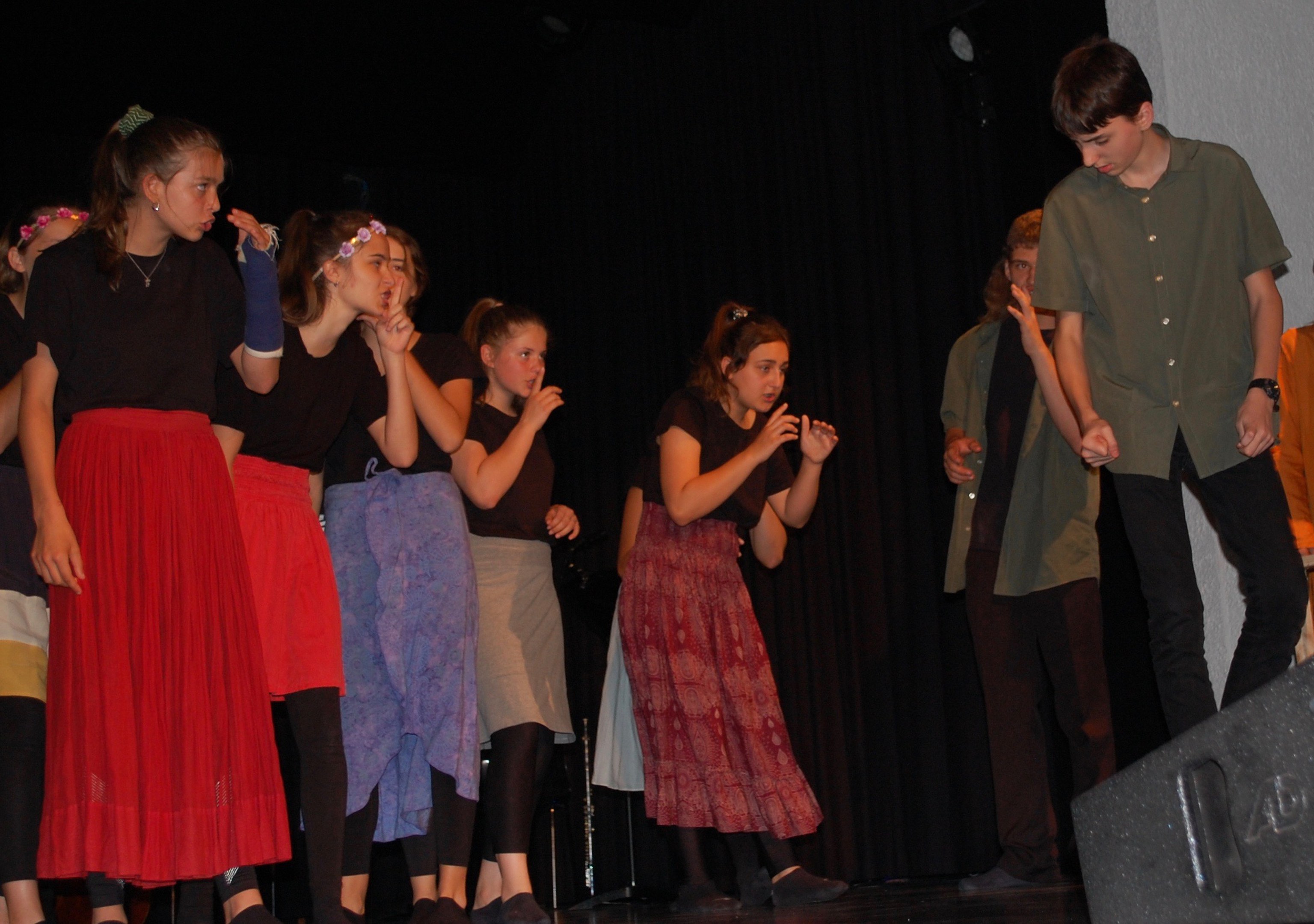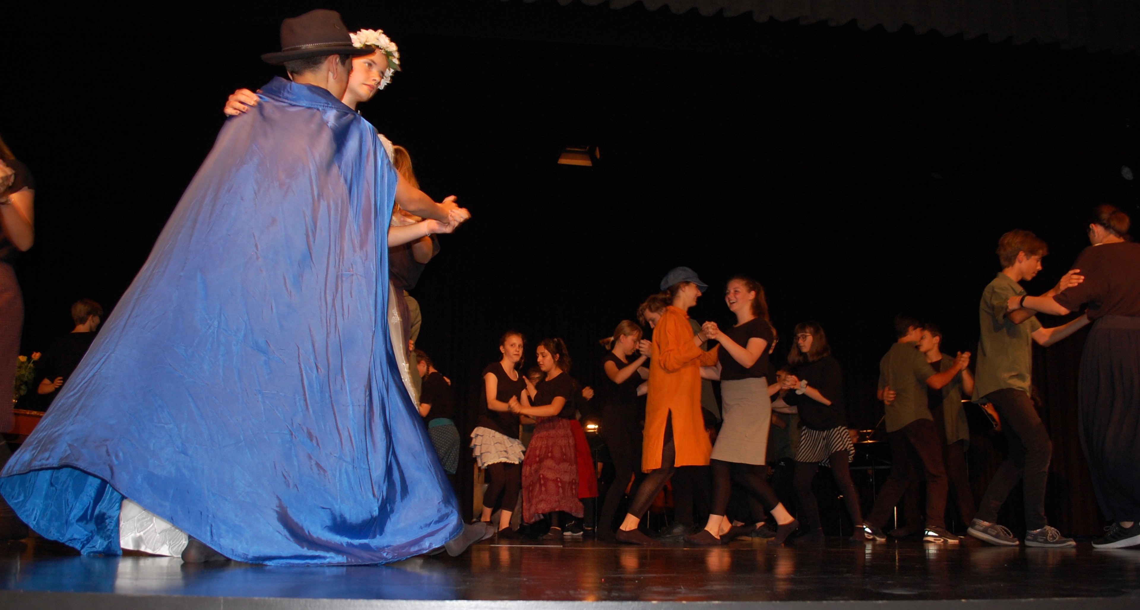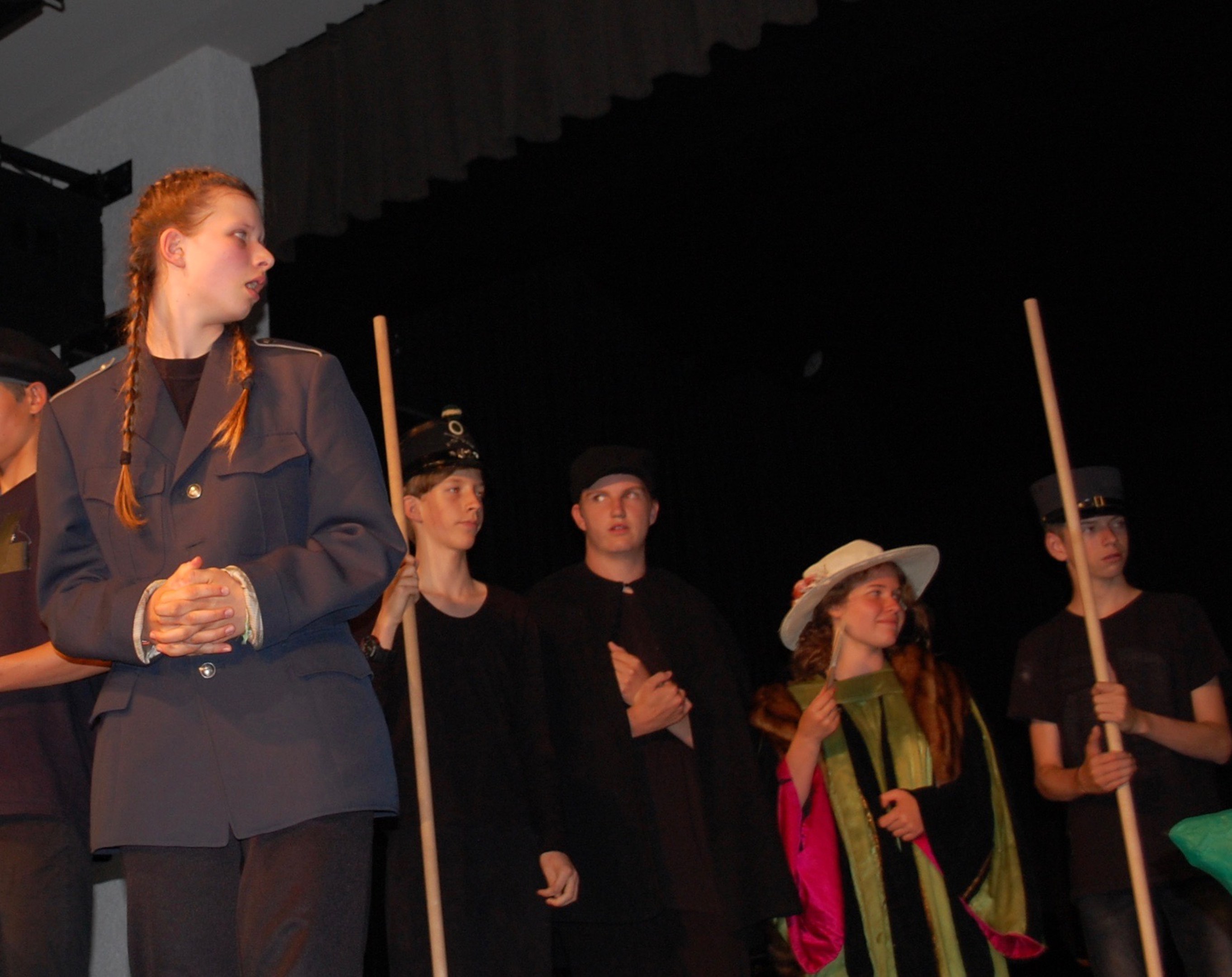 Am Montagmorgen der Sonderwoche »Musisches Projekt« kannten (fast) alle 40 Beteiligten ihre Rolle auswendig. Sie wussten, am Donnerstagabend würde die Aufführung stattfinden. Bis dahin musste die Rockband, das Streichquartett, das dreistimmige Lied, die Choreographie des Tanzes, die Masken, die Kleider, das ganze 5/4-stündige Theater bereit sein. Ohne Verstärkung und das in der grossen Aula.
