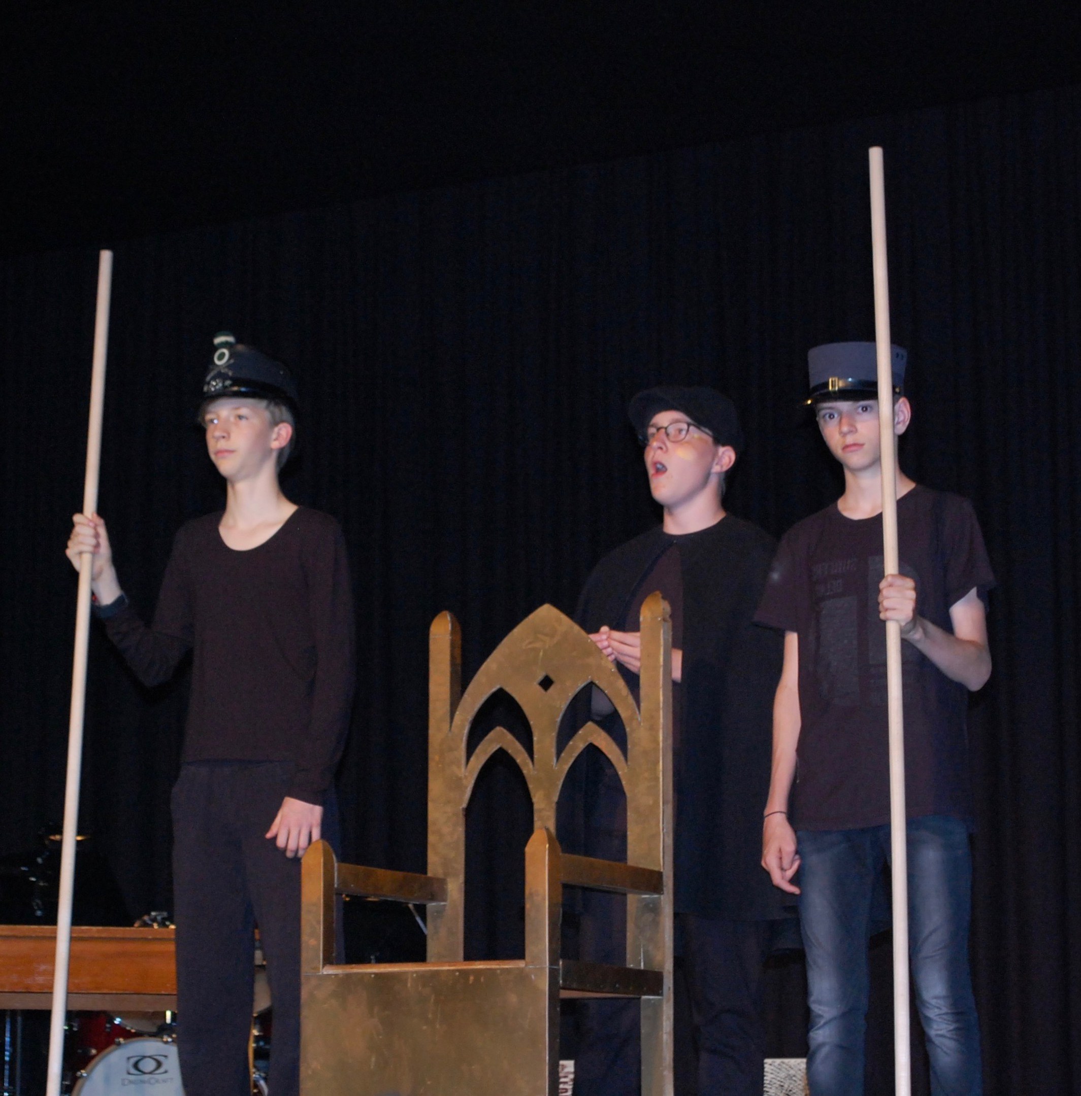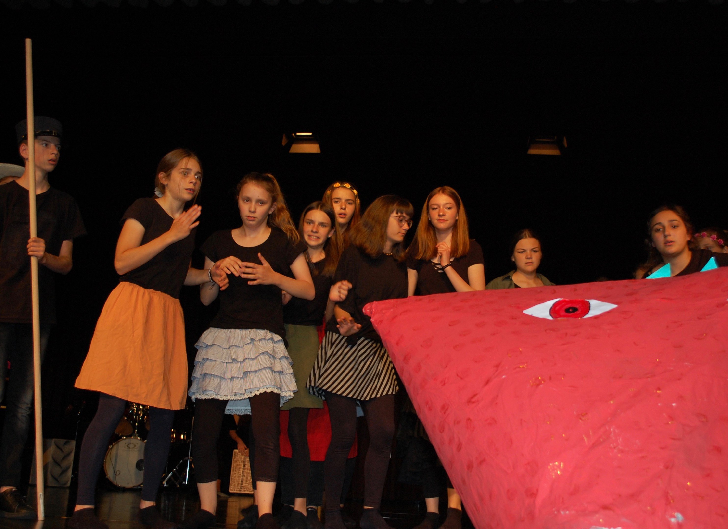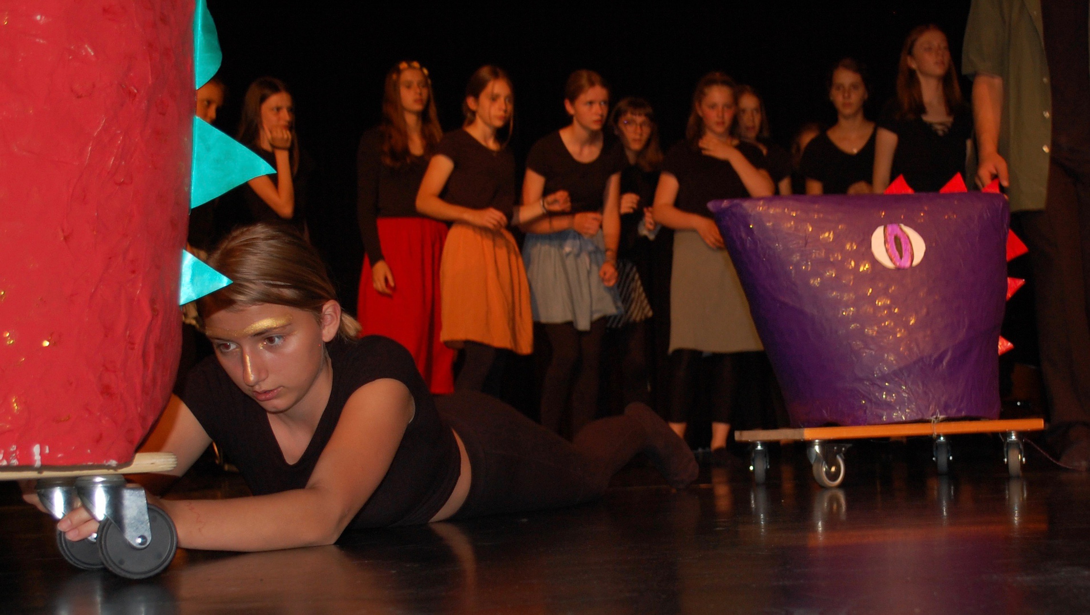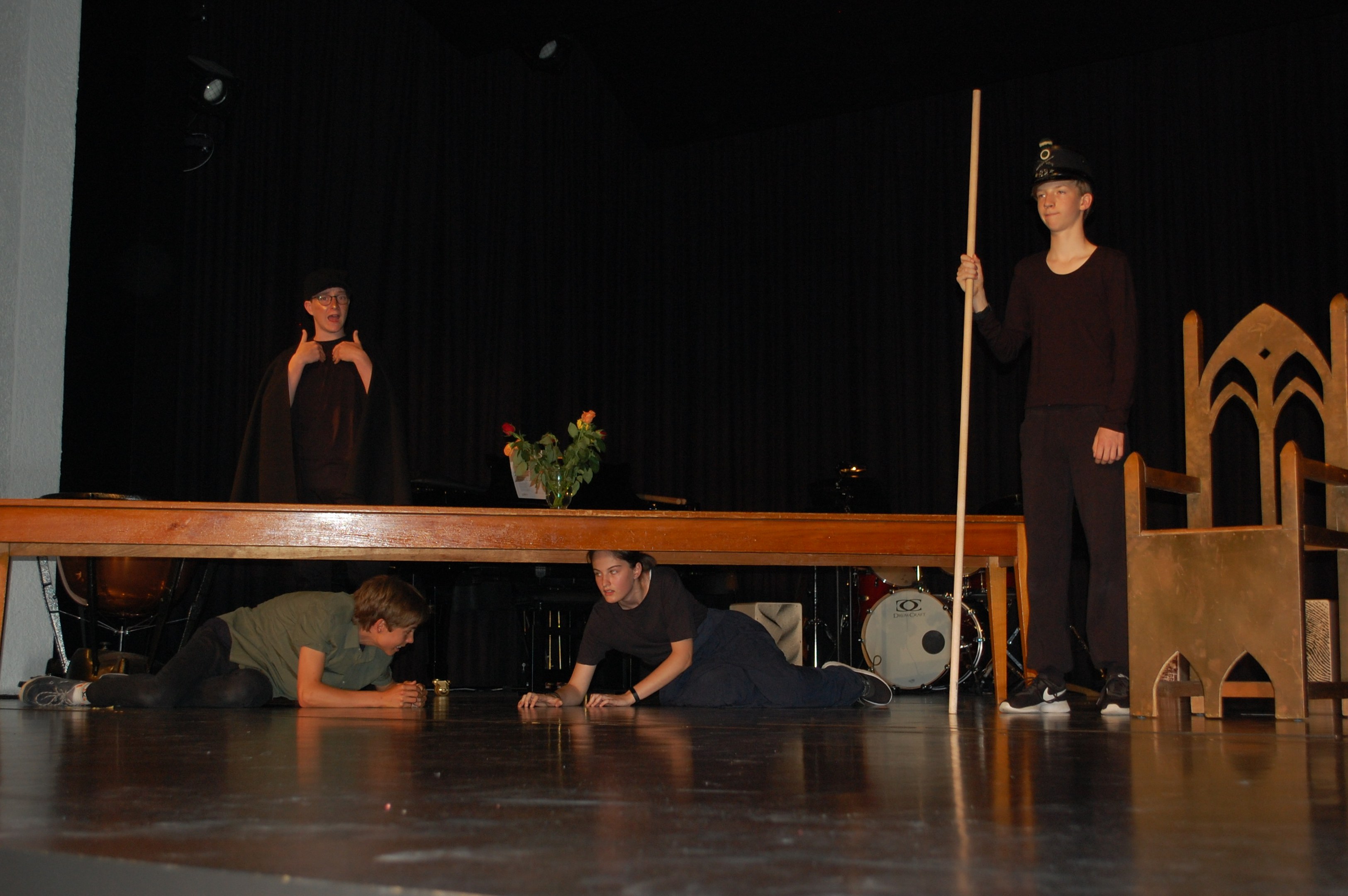 Alle waren sich bewusst, dass wir höchst konzentriert zusammenarbeiten mussten, um dieses Ziel zu erreichen. Und wirklich, am Donnerstagabend gab es keine Schülerinnen mehr, sondern die Katze half Ritter Lanzelot und Elsa, die richtigen Entscheidungen zu treffen, der gefährliche Drache drohte mit der Vernichtung der ganzen Stadt und auf einem unsichtbaren Teppich entschwebte Lanzelot den Blicken der Zuschauer, um den Drachen zu bekämpfen. Dessen drei Köpfe donnerten einer nach dem anderen abgeschlagen auf der Bühne.