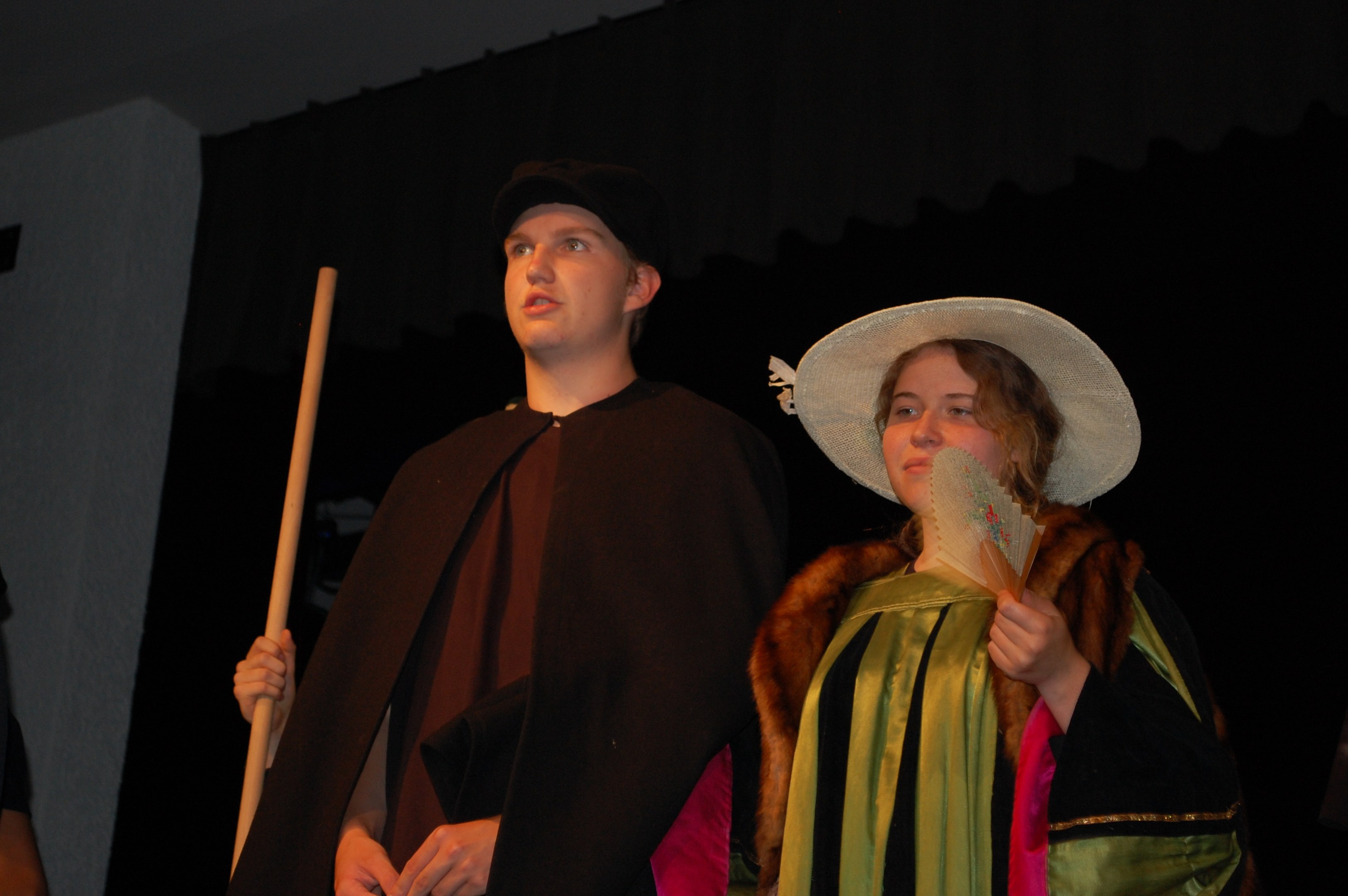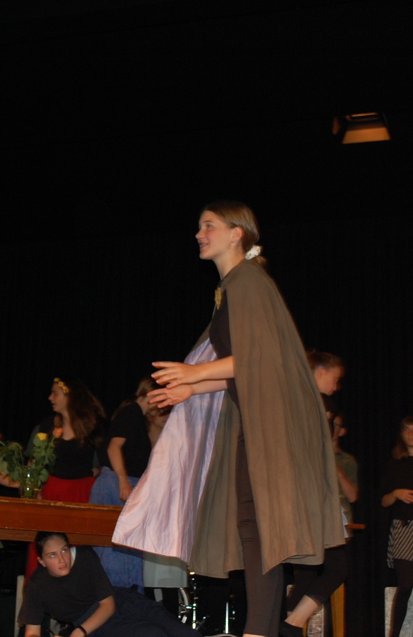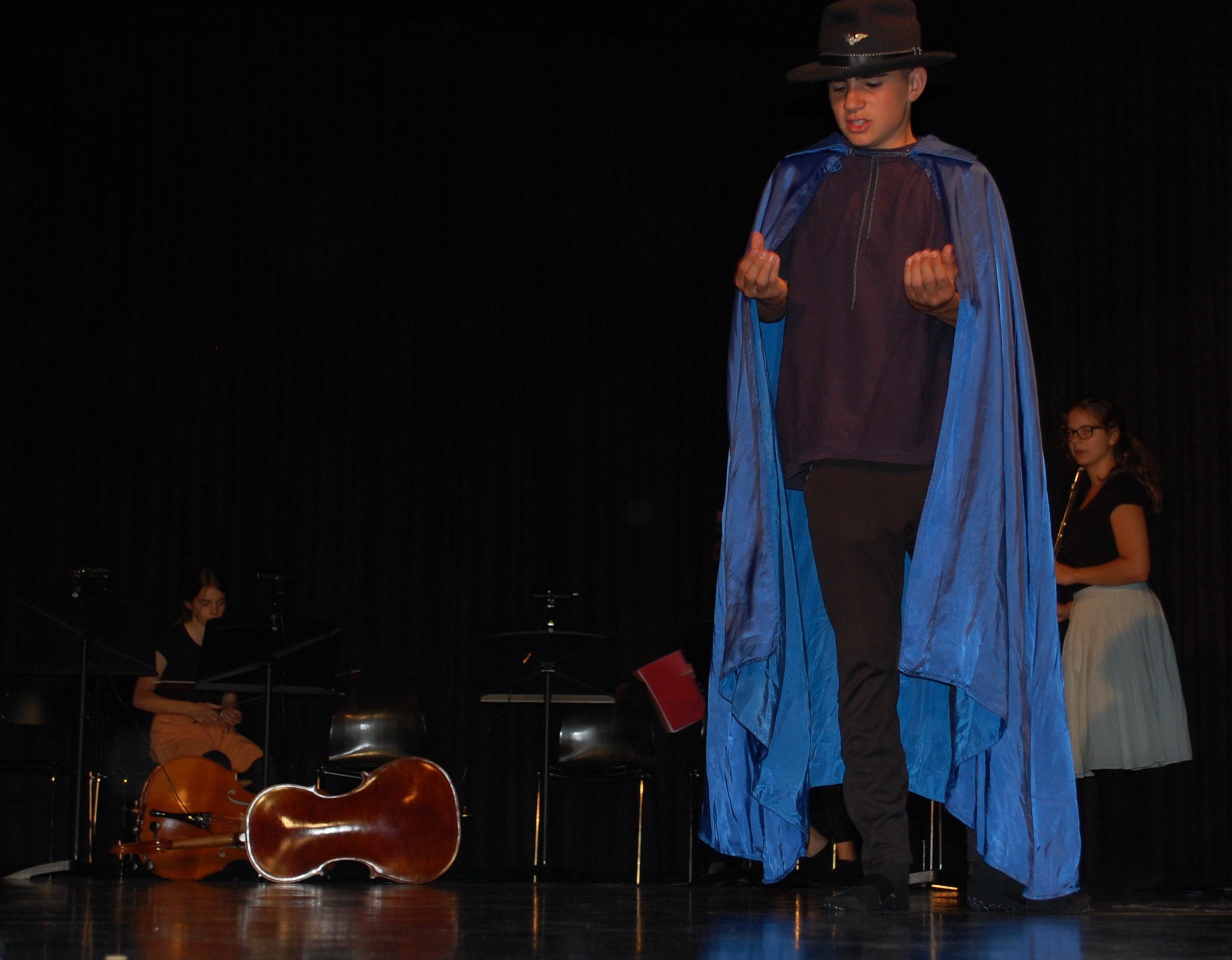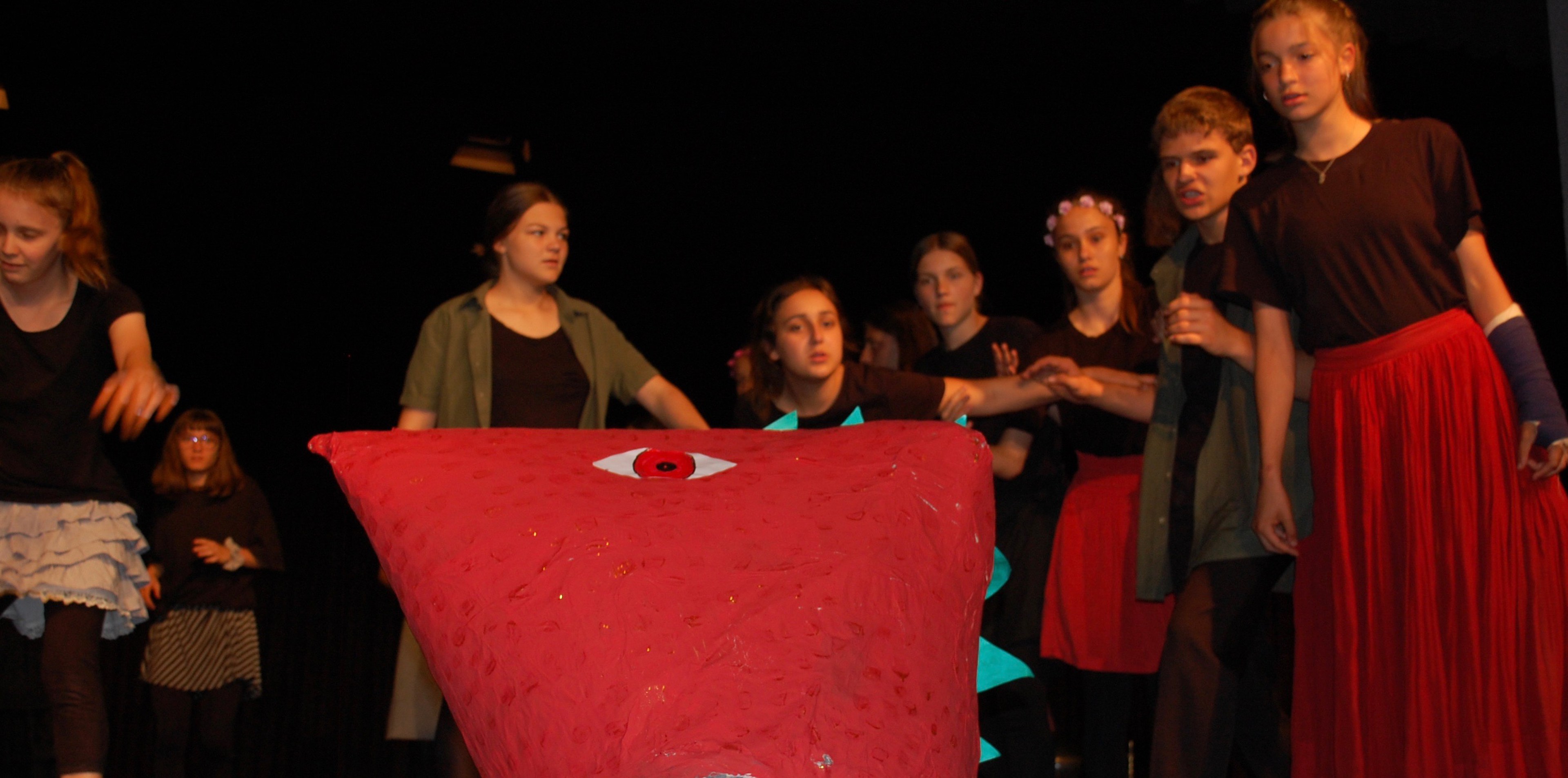 Alle waren sich bewusst, dass wir höchst konzentriert zusammenarbeiten mussten, um dieses Ziel zu erreichen. Und wirklich, am Donnerstagabend gab es keine Schülerinnen mehr, sondern die Katze half Ritter Lanzelot und Elsa, die richtigen Entscheidungen zu treffen, der gefährliche Drache drohte mit der Vernichtung der ganzen Stadt und auf einem unsichtbaren Teppich entschwebte Lanzelot den Blicken der Zuschauer, um den Drachen zu bekämpfen. Dessen drei Köpfe donnerten einer nach dem anderen abgeschlagen auf der Bühne.