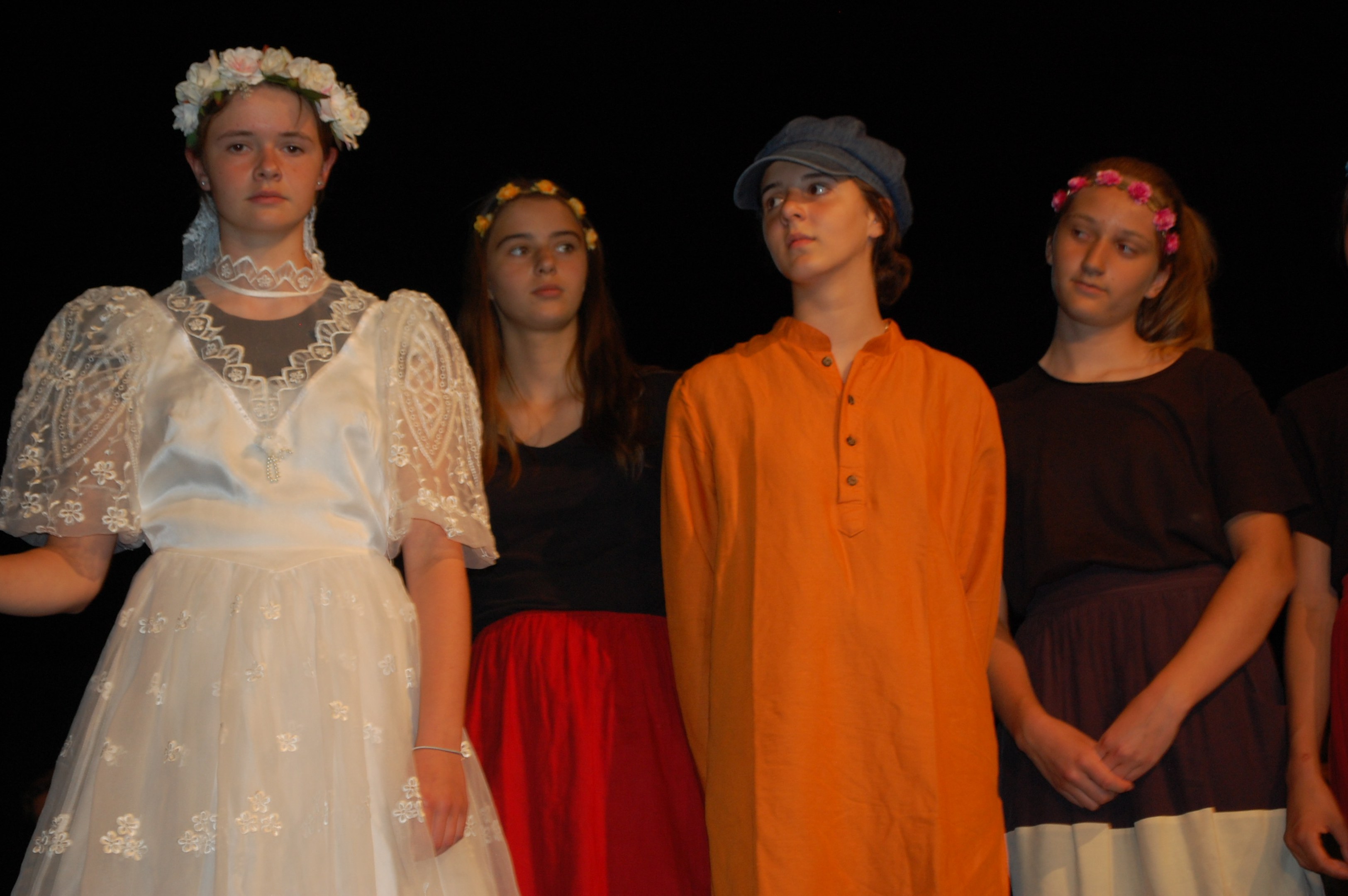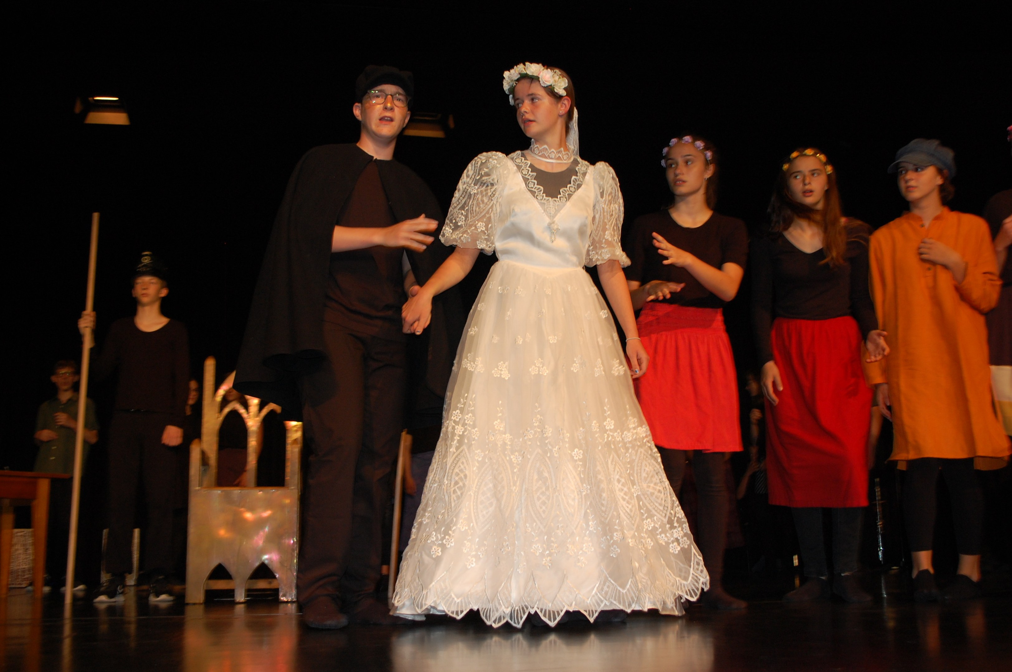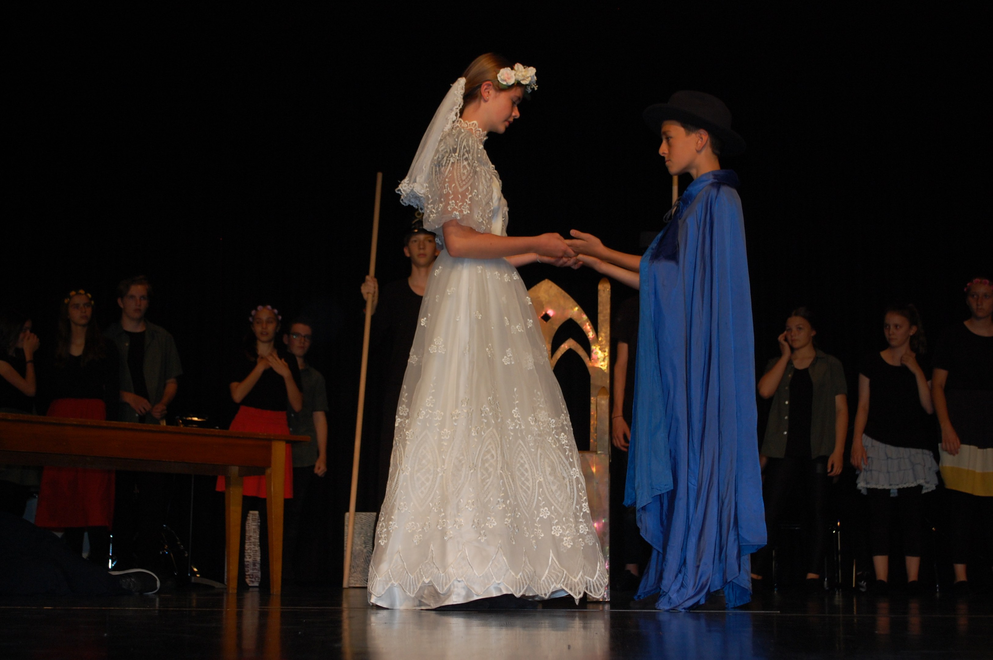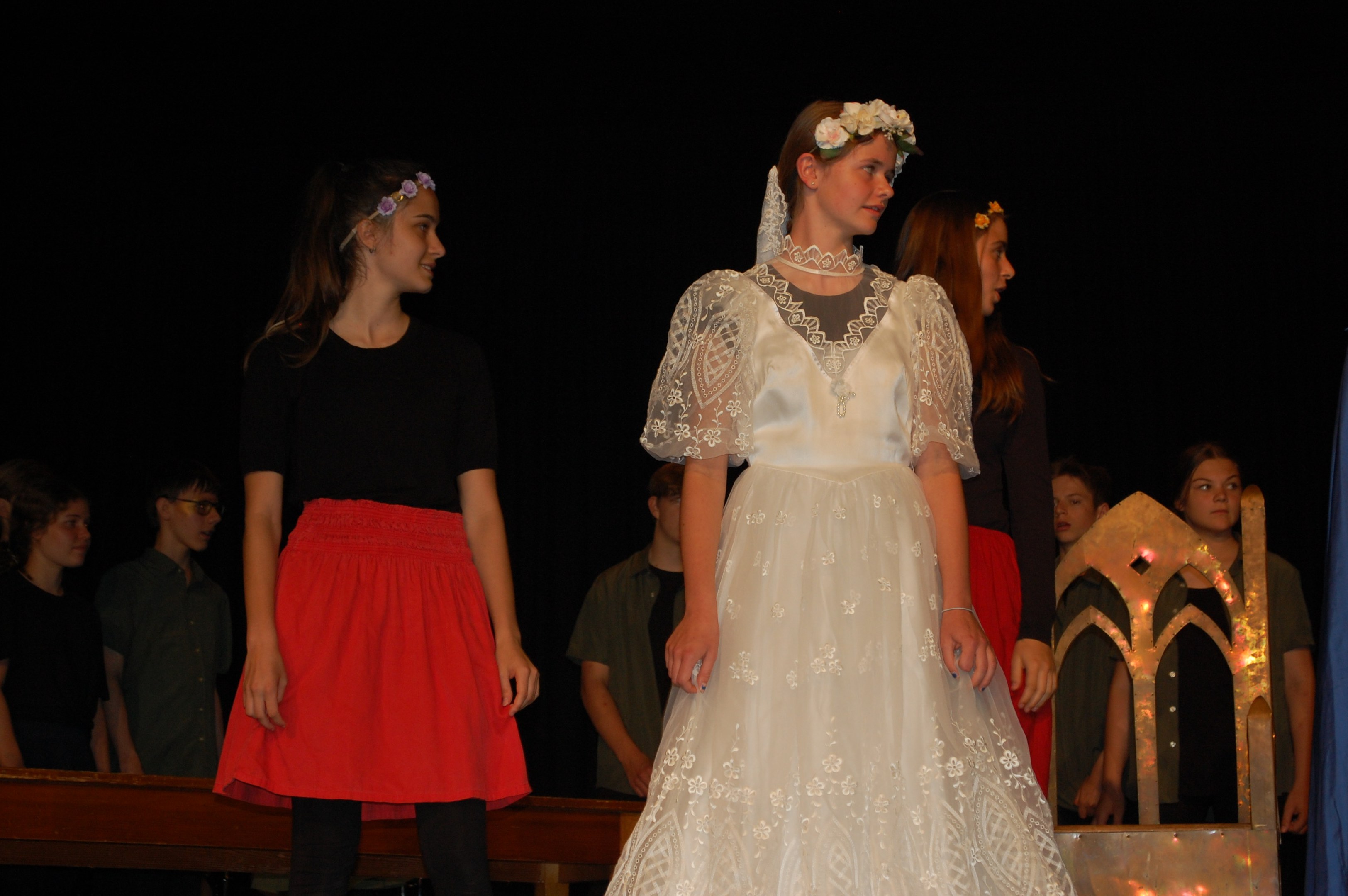 Alle waren sich bewusst, dass wir höchst konzentriert zusammenarbeiten mussten, um dieses Ziel zu erreichen. Und wirklich, am Donnerstagabend gab es keine Schülerinnen mehr, sondern die Katze half Ritter Lanzelot und Elsa, die richtigen Entscheidungen zu treffen, der gefährliche Drache drohte mit der Vernichtung der ganzen Stadt und auf einem unsichtbaren Teppich entschwebte Lanzelot den Blicken der Zuschauer, um den Drachen zu bekämpfen. Dessen drei Köpfe donnerten einer nach dem anderen abgeschlagen auf der Bühne.