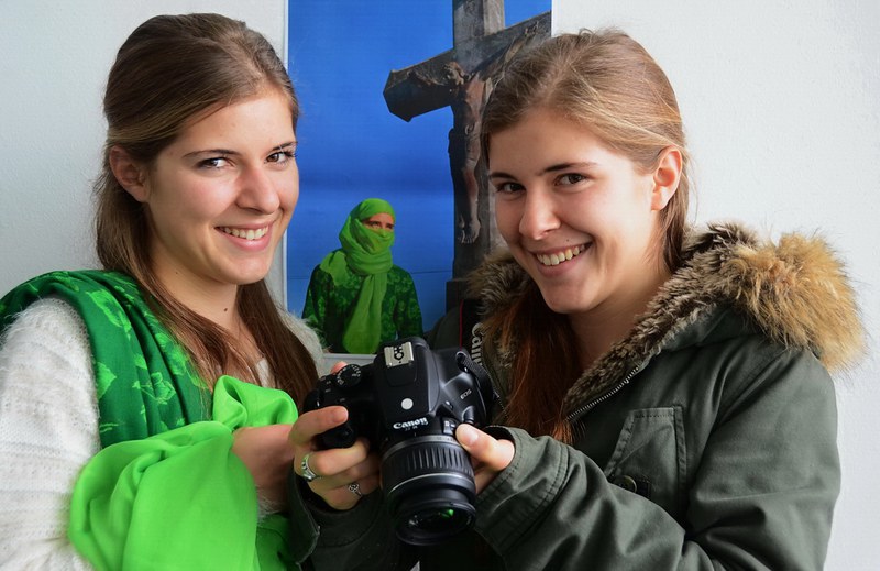 Es dauerte eine Weile, bis wir eine gute Idee fanden, um den Islam und das Christentum zusammen deutlich erkennbar abzulichten. Doch als wir den Entschluss gefasst hatten, gab es eigentlich keine Schwierigkeiten mehr. Wir haben uns Zeit gelassen beim Ausprobieren, zuerst vor einer kleinen Kapelle und dann vor dem Kreuz, was uns schliesslich mehr überzeugt hat.