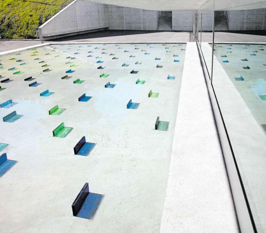 Zu diesem Erweiterungsbau gehört ein grosses, rechteckiges Wasserbecken, ebenfalls aus Beton, das an seine östliche, im Erdgeschoss zurückversetzte Fassade grenzt. Dieses fasst eine von zwei Architekturinterventionen von Elisabeth Arpagaus, die als Siegerprojekt des Kunst-am-Bau-Wettbewerbs hervorgegangen sind. Das Kunstwerk ist überaus schlicht und entfaltet seine Präsenz still und poetisch: Im Wasserbecken sind in freien Rhythmen schmal-rechteckige Glasbausteine platziert. In ihren blauen und grünen Farbnuancen nehmen sie die Töne des Wassers auf. Bei Sonnenbestrahlung werfen sie bunte Schatten auf den Brunnenboden, die sich im Gleichklang des Wassers bewegen. Die Installation beruhigt den aufgewühlten Geist und belebt die schlichte Architektur.