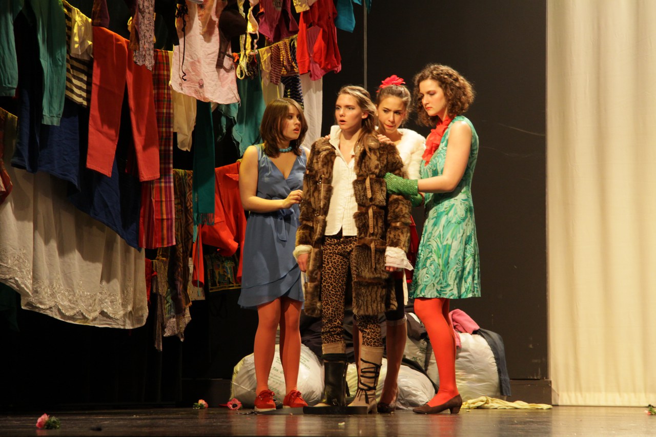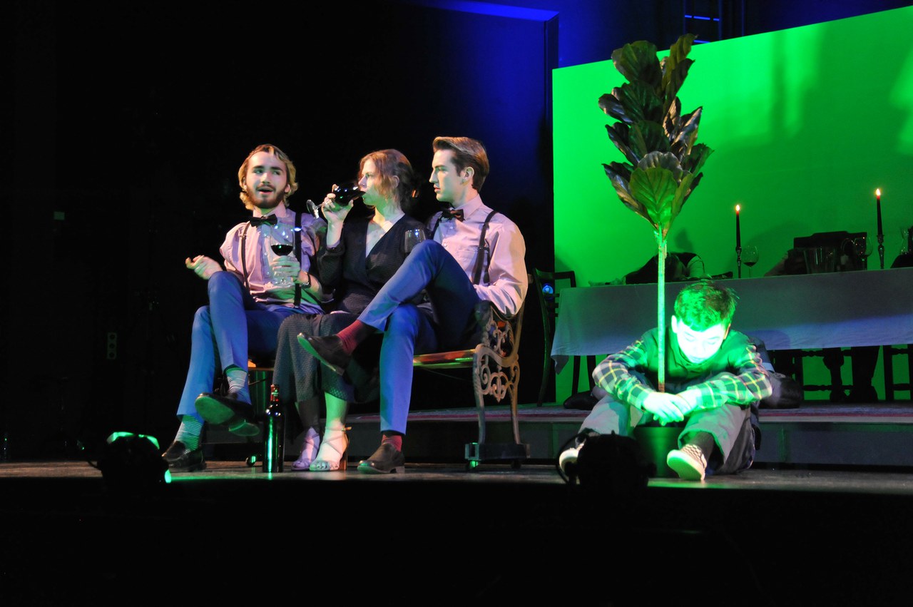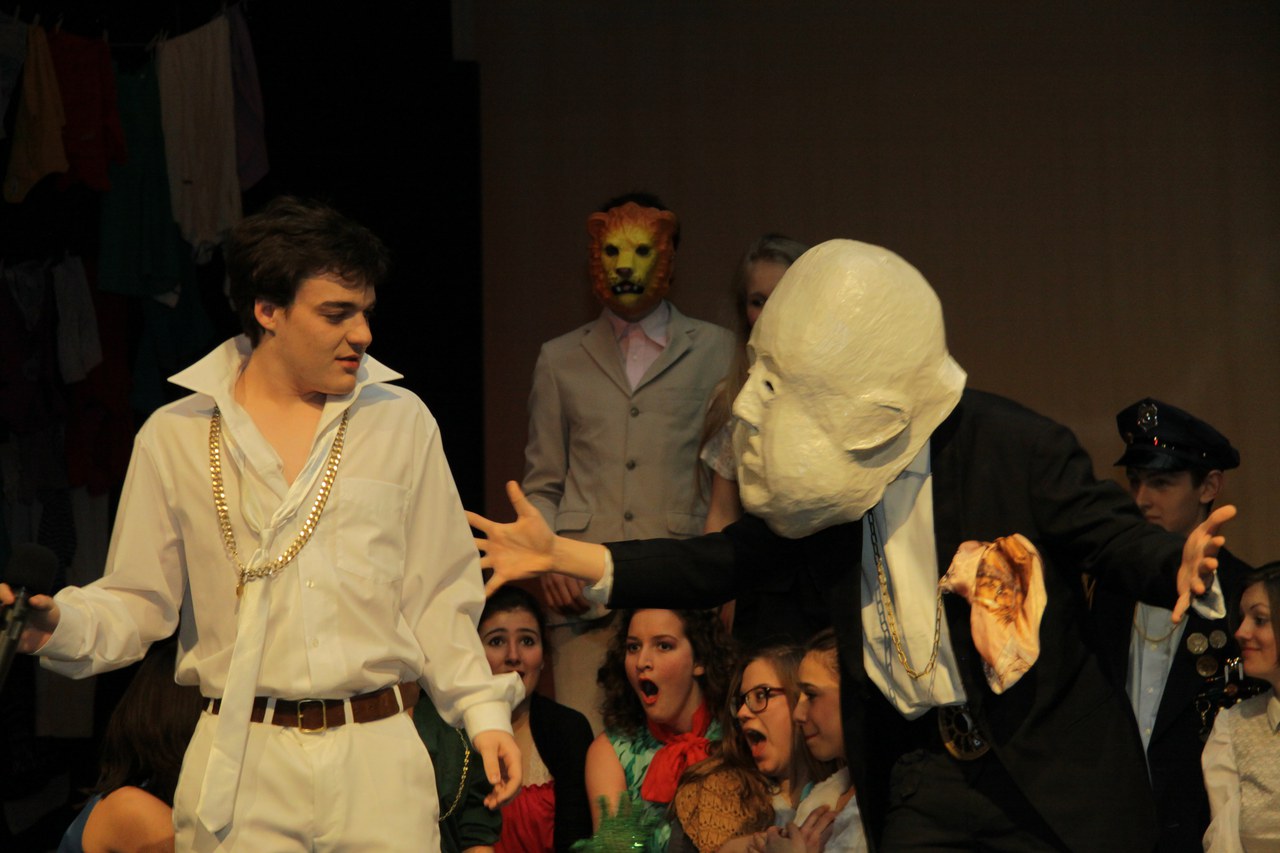 Das KantiTheaterZug hat aus der Lektüre des Gatsby ein Stück im Stück gemacht. Auf der (Lebens-)Bühne wird das Theaterstück geprobt und immer wieder von der energischen Regisseurin unterbrochen. Wir erleben die SpielerInnen privat wie sie miteinander sprechen und auf der Bühne, wie sie in ihre Rolle schlüpfen. Sie brauchen sich nur ihre Perücken und ihr Kleidungsstück von der Garderobenstange zu nehmen und schon sind sie in der glitzernden Welt der Upper class.