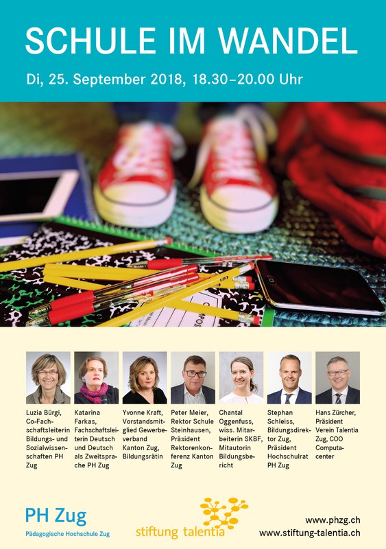 In ihrem Referat stellt Chantal Oggenfuss, SKBF, die Resultate des Bildungsberichts Schweiz 2018 vor und zeigt auf, wie und wo sich die Schule im Verlauf der Jahre gewandelt hat. Unter der Moderation von Katarina Farkas, Fachschaftsleiterin Deutsch und Deutsch als Zweitsprache PH Zug, diskutieren Vertreterinnen und Vertreter aus Bildung, Wirtschaft und Politik über die Resultate des Bildungsberichts und ihre Erwartungen an die Schule, u.a. im Hinblick auf die Einführung des Lehrplans 21 im Schuljahr 2019/20 im Kanton Zug.